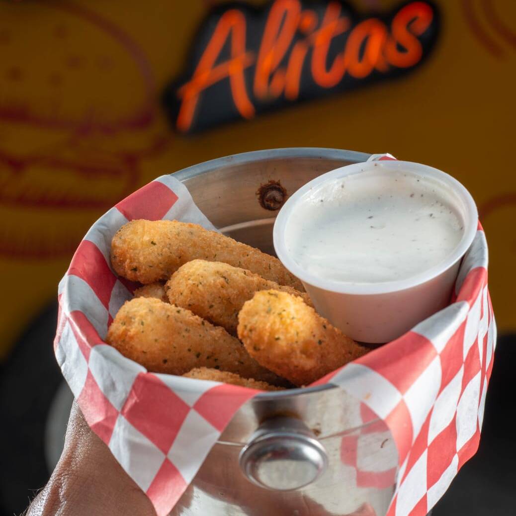 6 PIEZAS DE DEDOS DE QUESO MOZARELLA, ACOMPAÑADOS DE ADEREZO DE QUESO AZUL