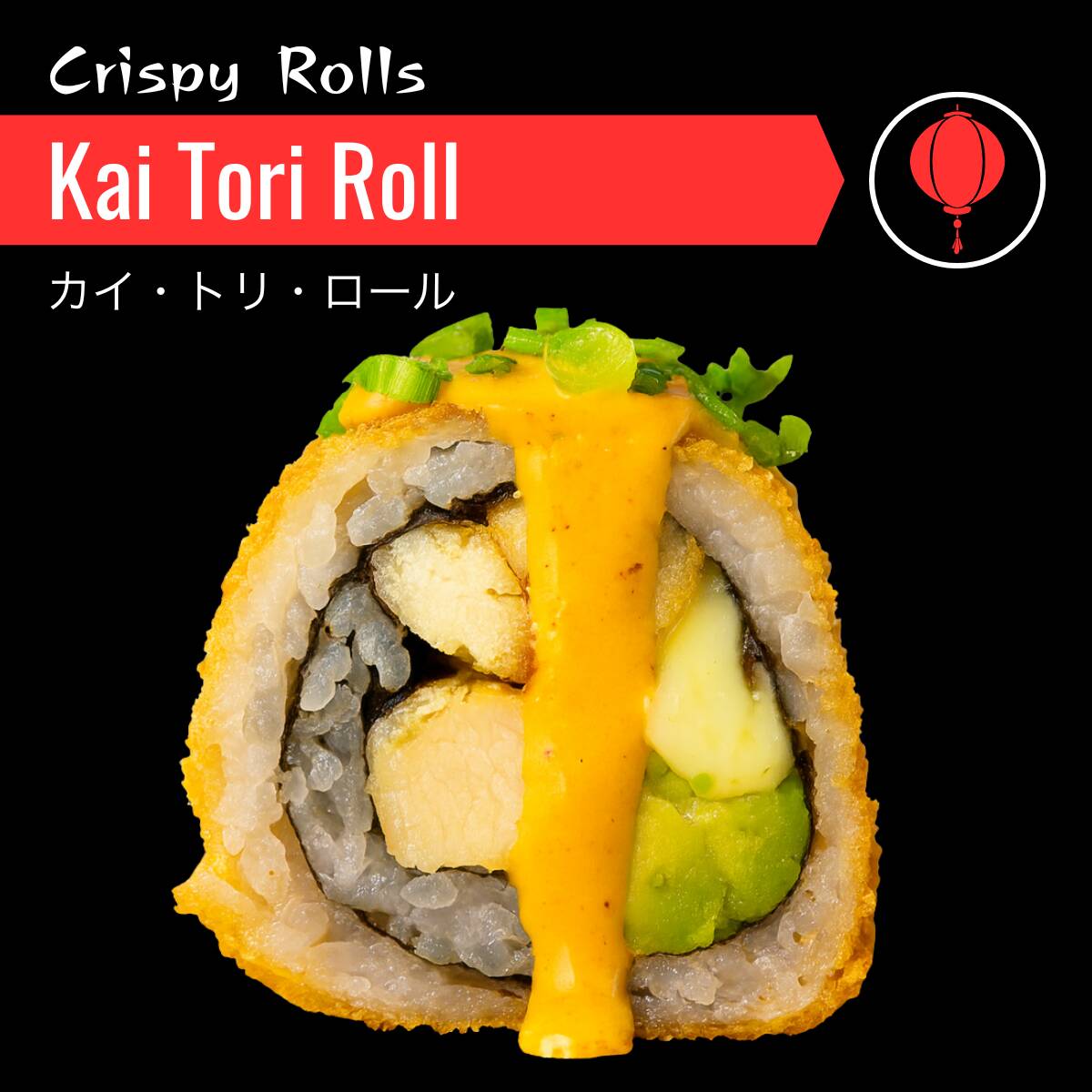 Rollo de sushi de 8 pz, empanizado con panko, relleno de pollo a la plancha, queso menonita y aguacate, con salsa spacymayo y cebollin.