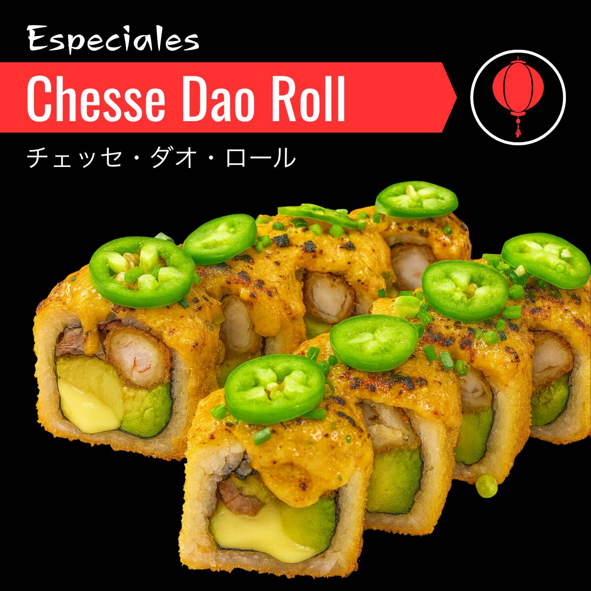 Rollo de Sushi ed 8 pz, empanizado con Panko, relleno de Arrachera, Aguacate, Queso Menonita y Camaron EMpanizado, Cubierto de Salsa de Queso Cheddar con Jalapeño Gratinado, con CEbollin y rodajas de Chile Serrano.