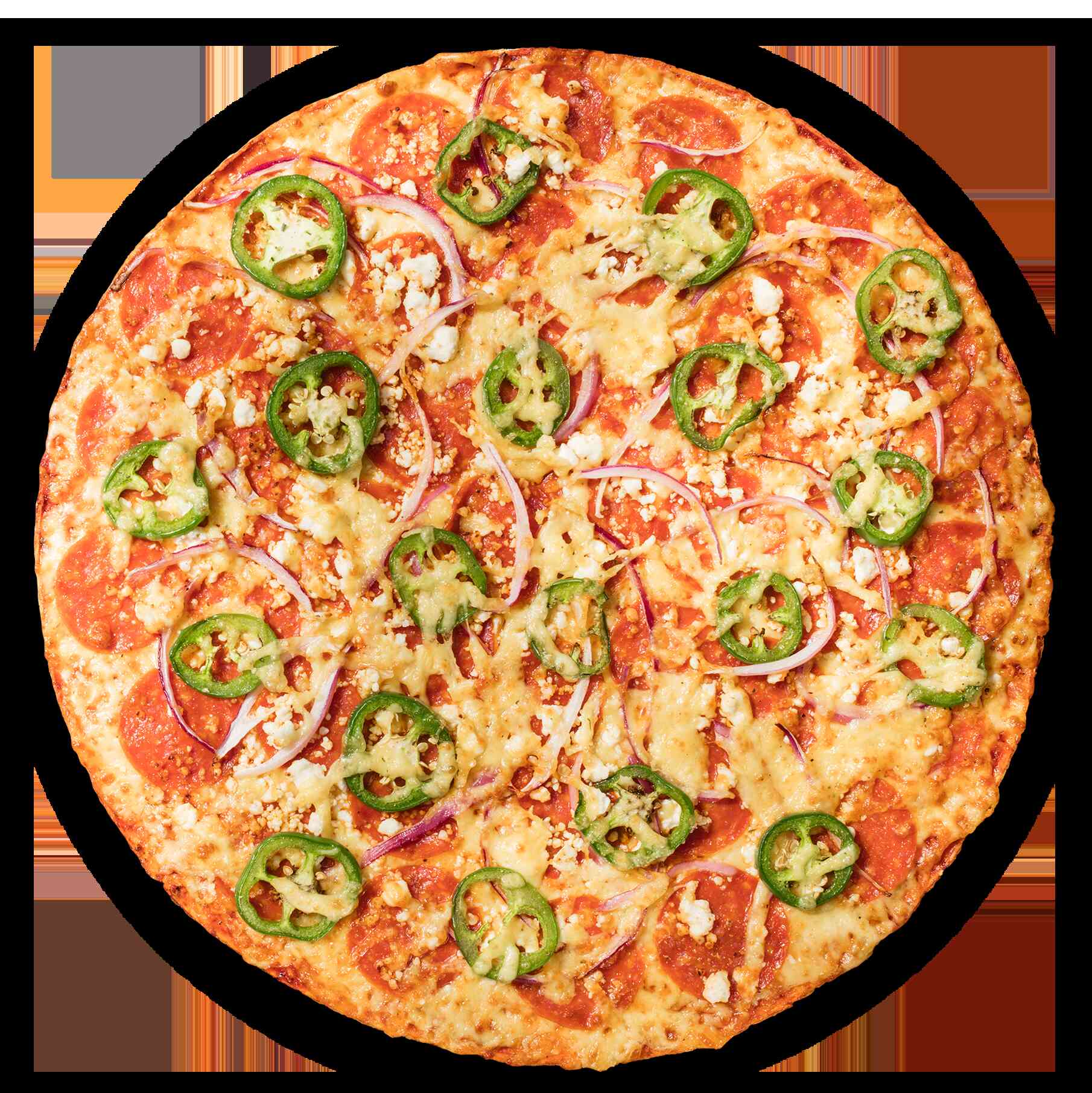 Pepperoni, queso feta, cebolla morada y jalapeño.
