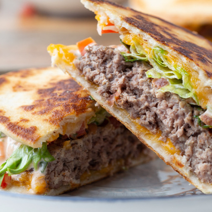 Tortillina, carne de hamburguesa, queso fundido, lechuga, aderezo y jalapeño