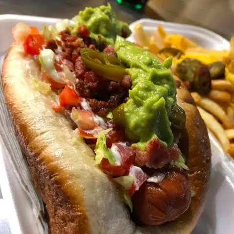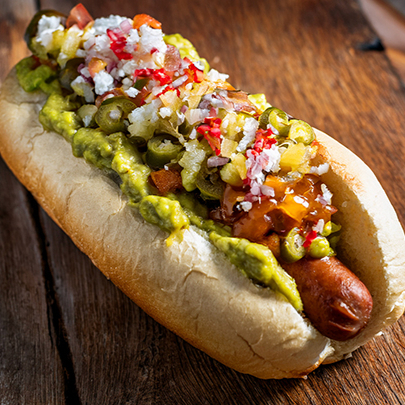 Salchicha jumbo, tocino, guacamole, queso Oaxaca fundido, chorizo, vegetales, catsup, mayonesa, mostaza