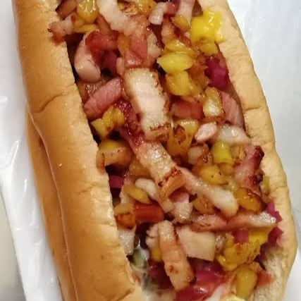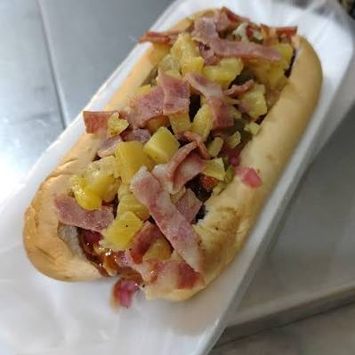 Salchicha jumbo, tocino, piña, queso Oaxaca fundido, catsup, mayonesa, mostaza