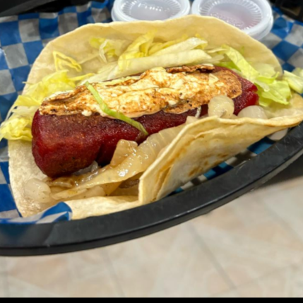 Tortillina, salchicha alemana, queso fundido, lechuga, aderezo y jalapeño