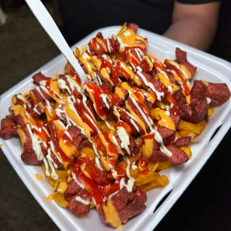 Papás a la francesa, trocitos de salchicha y tocino, queso cheddar fundido y aderezos