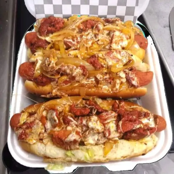 Salchicha de pavo, tocino, vegetales, chile jalapeño, catsup, mayonesa