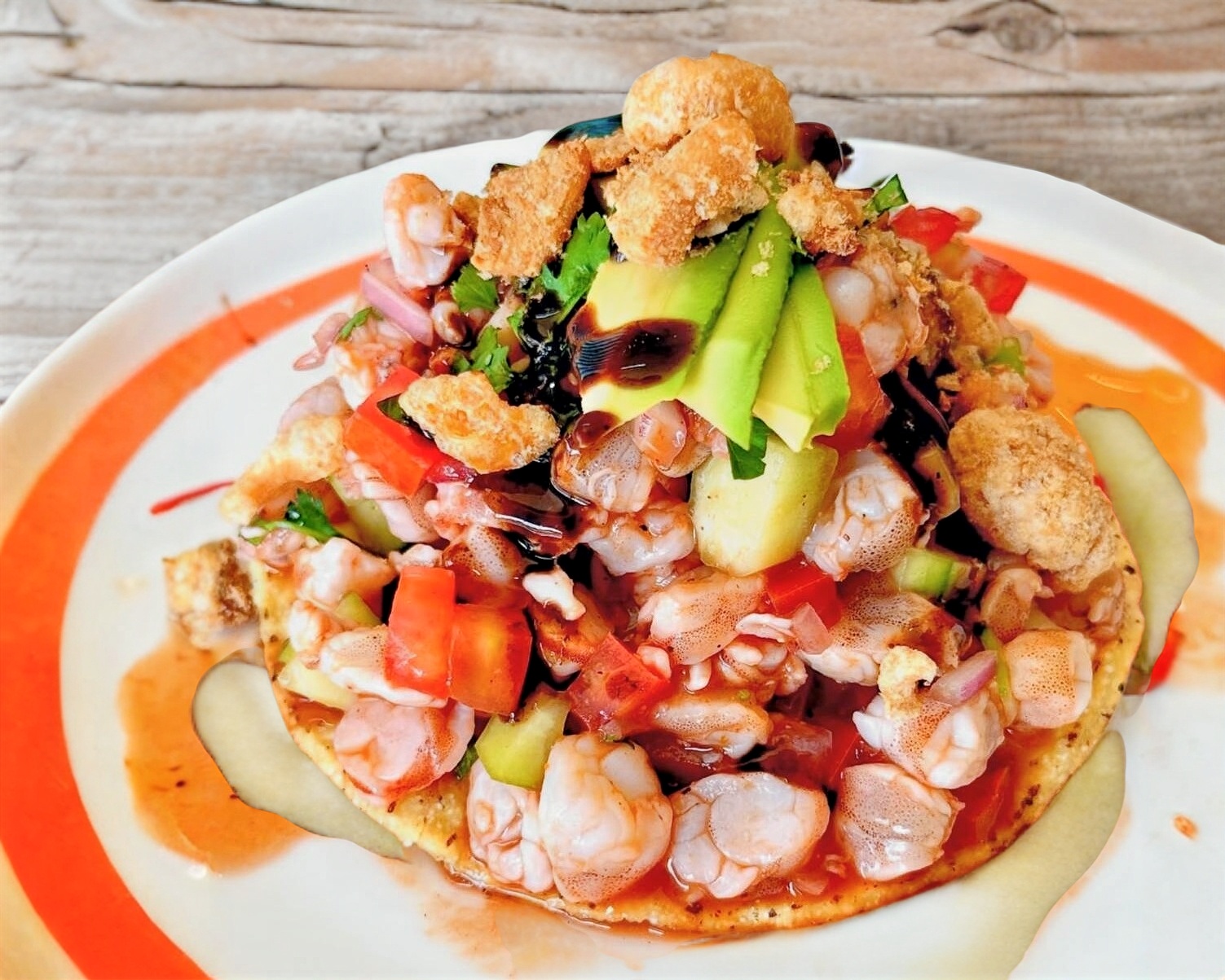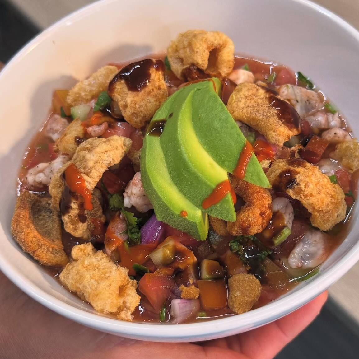 ceviche de camaron con topping de chicharron de cerdo con aguacate y salsas de la casa