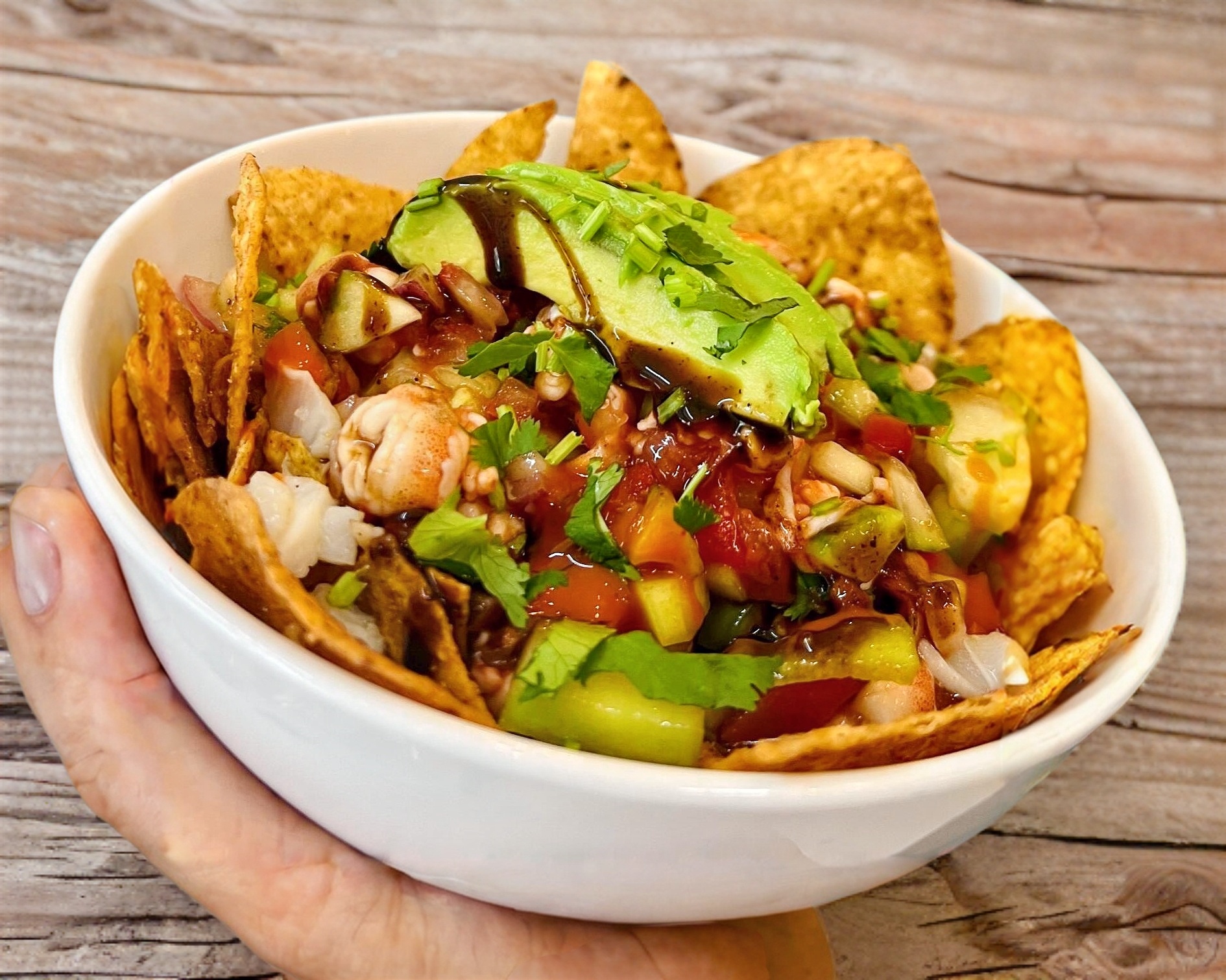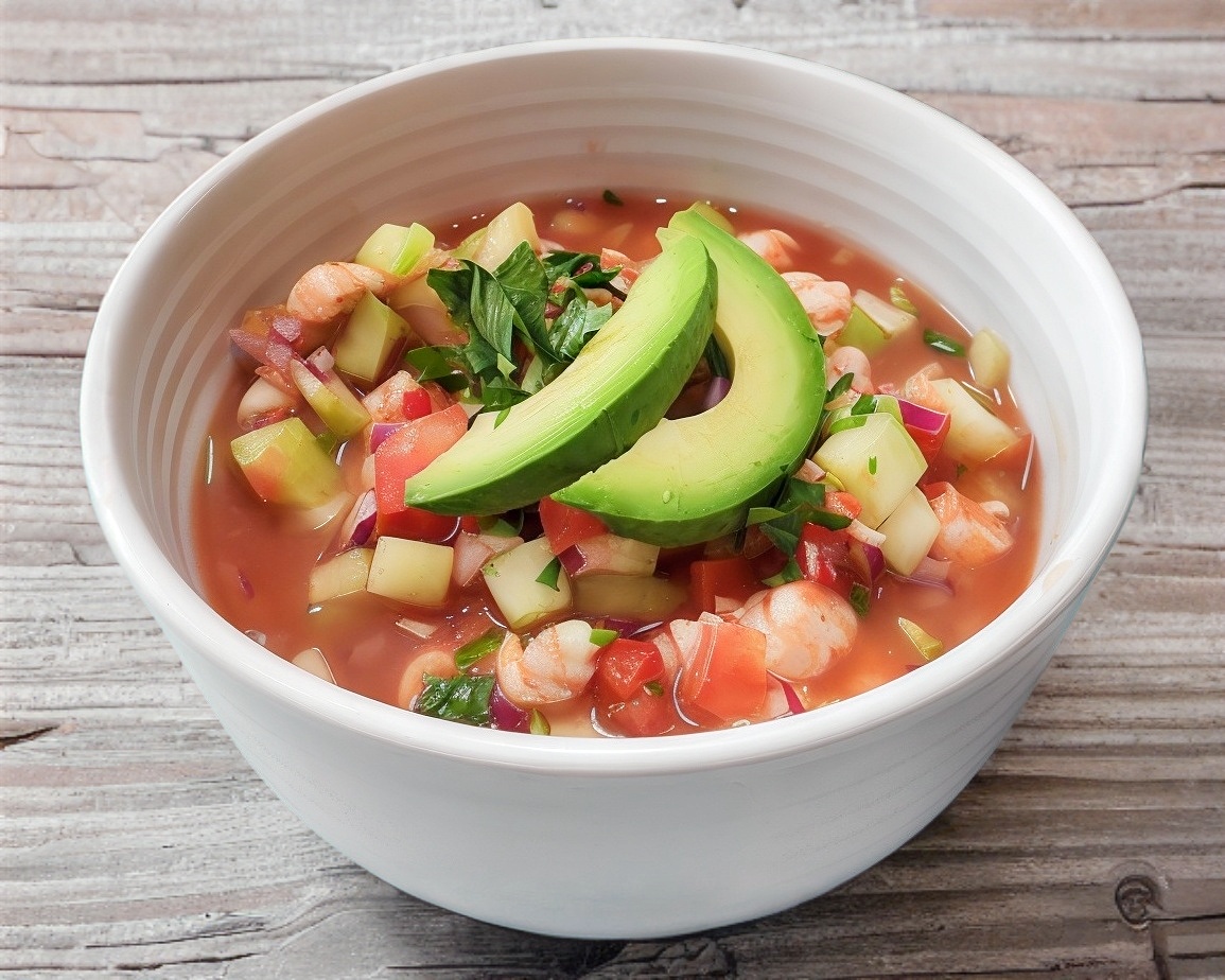 camaron curtido con limon con un mix de verduras mixtas y topping de aguacate