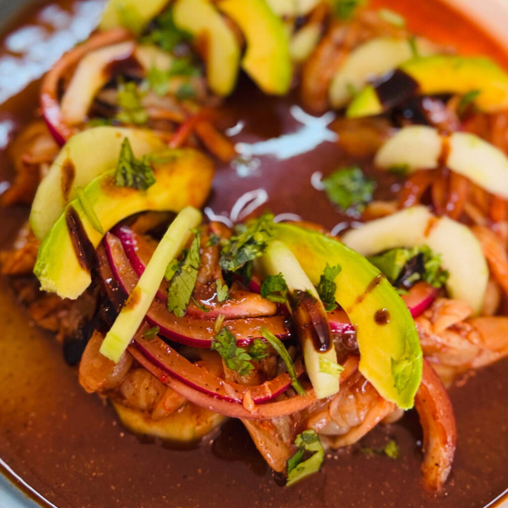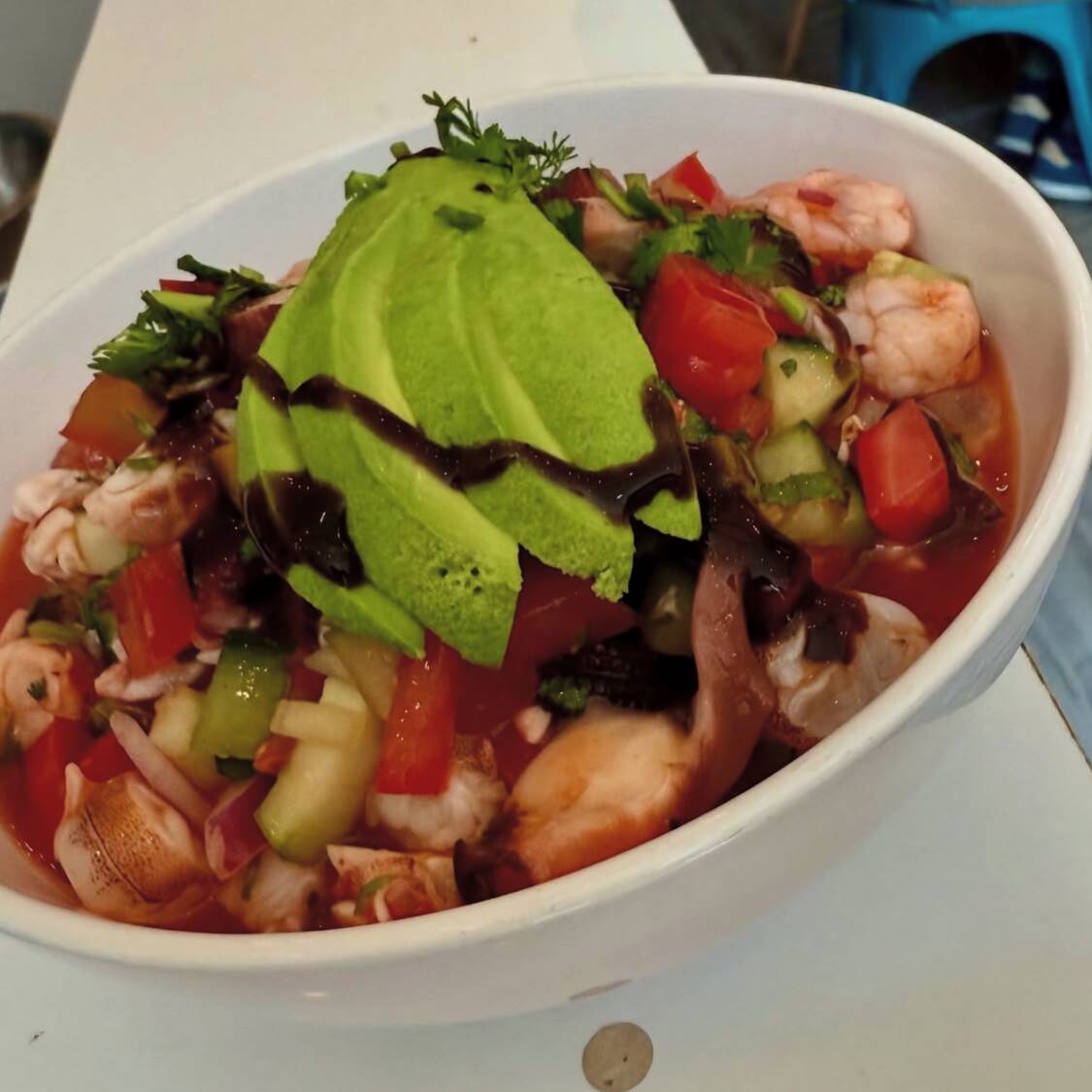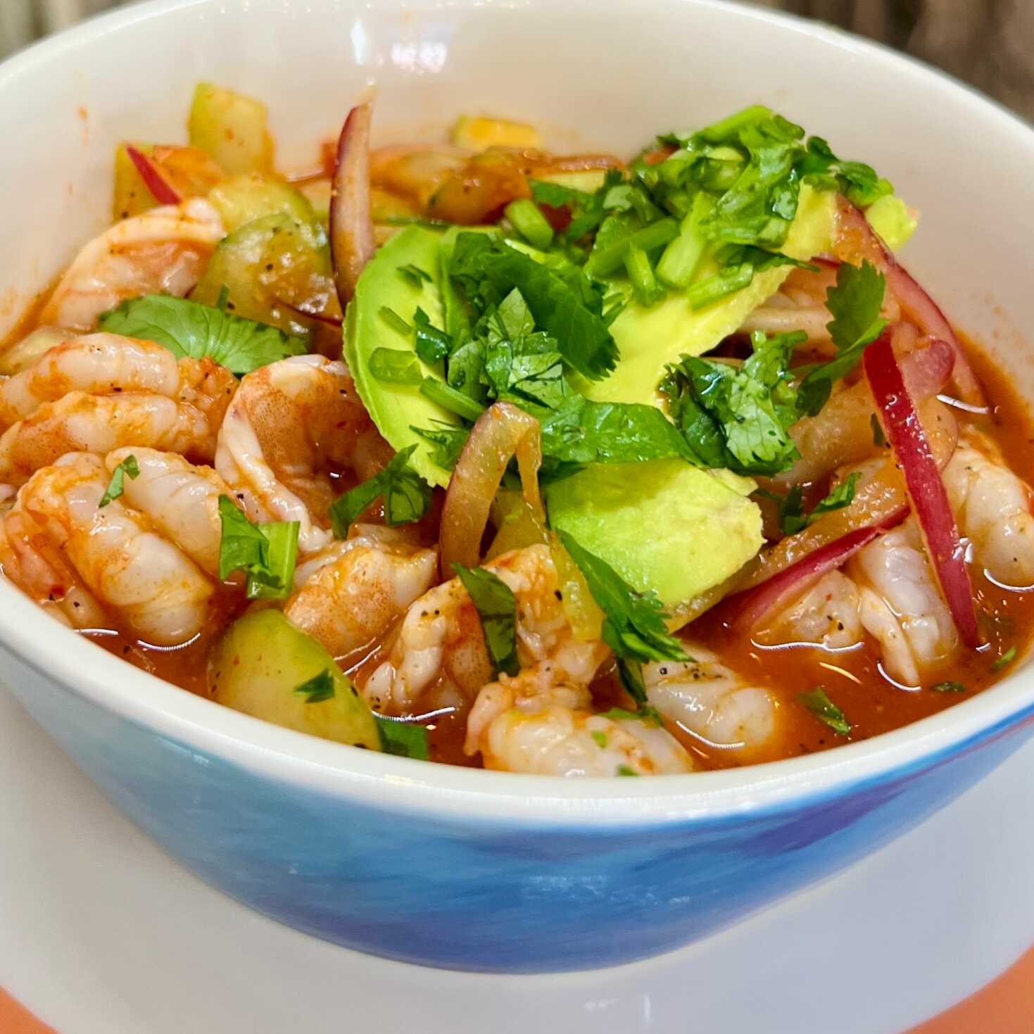 camarones curtida en salsas de chiles negros con pepino, cebolla y toping de aguacate y cilantro