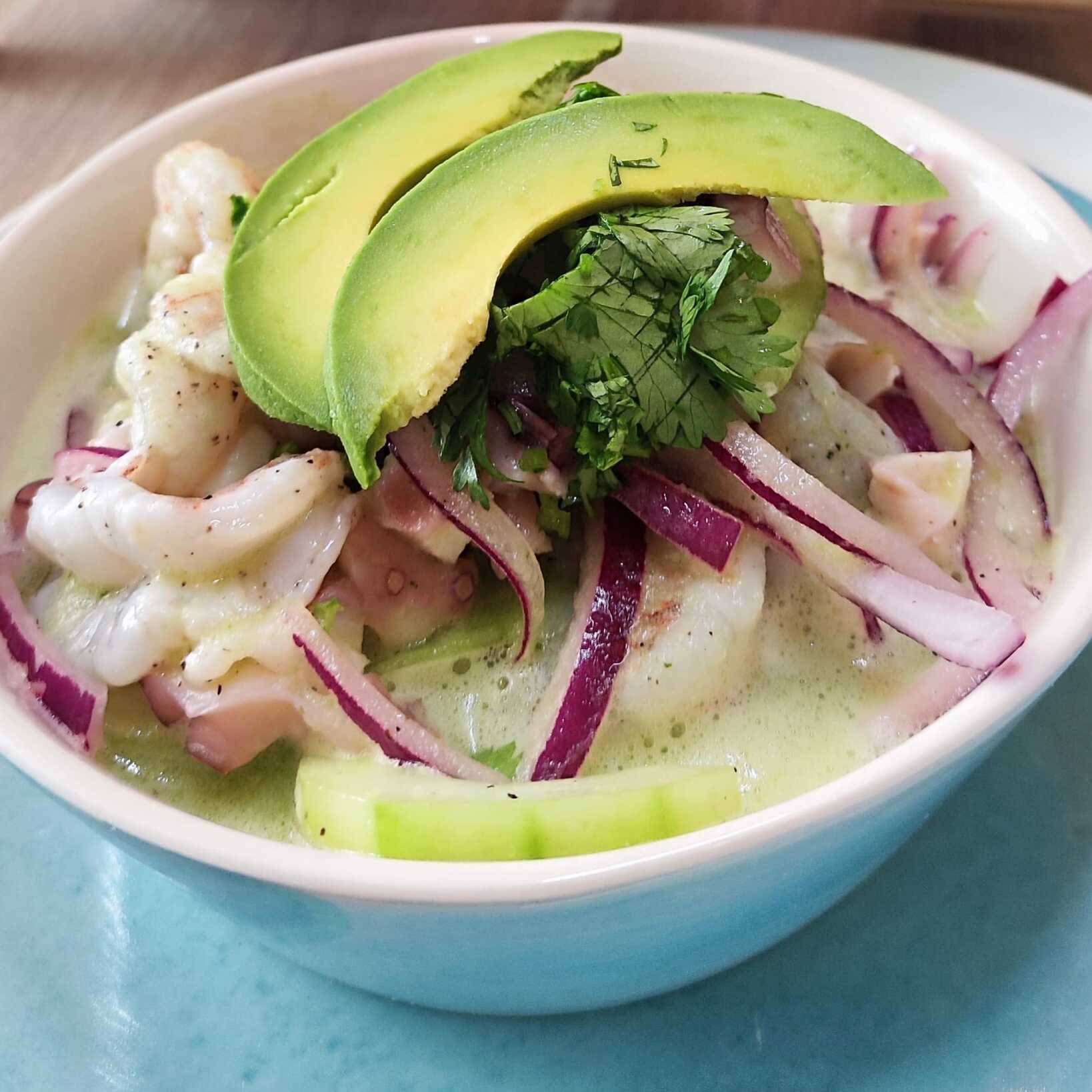 ceviche con las 3 proteinas pulpo, camaron y pescado.