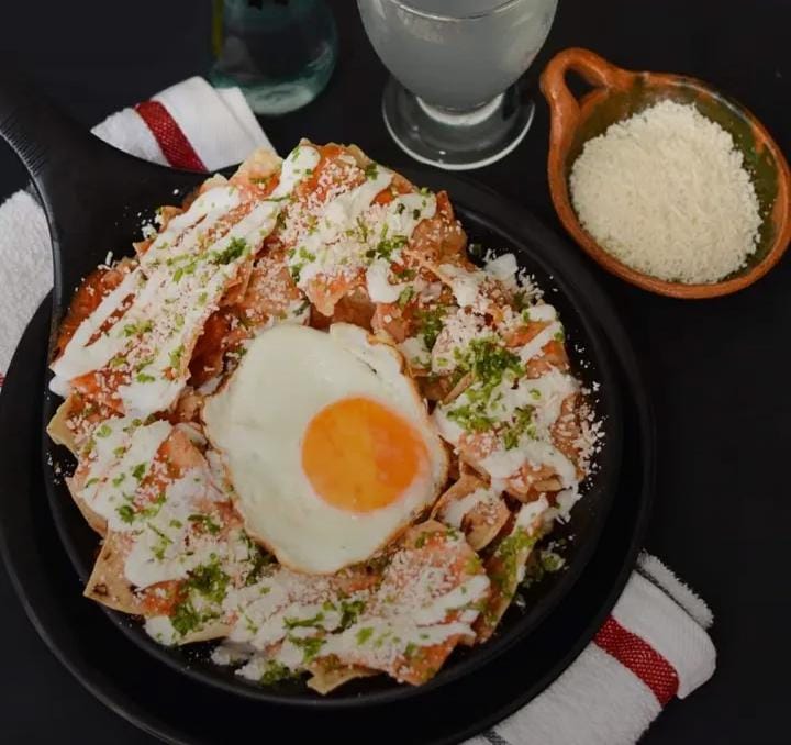 Orden de chilaquiles bañados en salsa roja, 2 huevos estrellados, media crema, queso y cebolla.