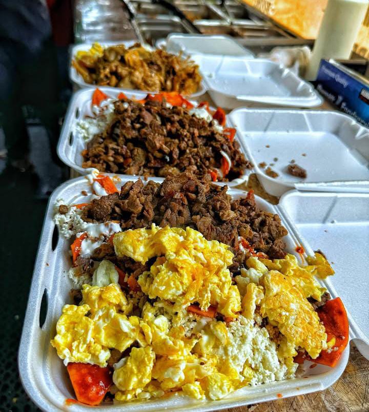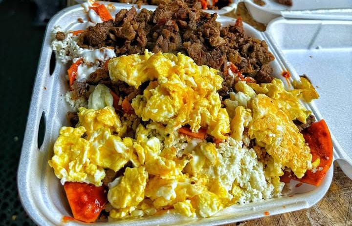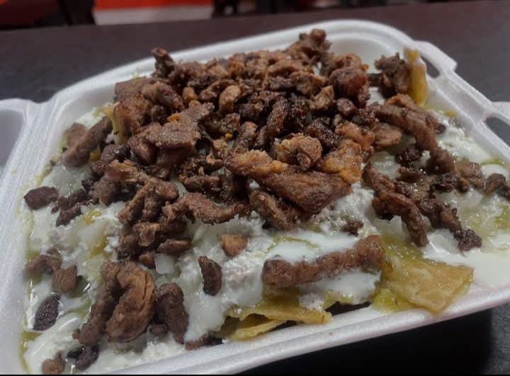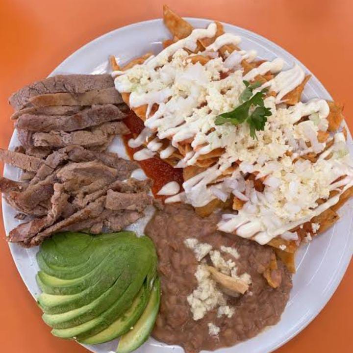 Una orden de chilaquiles completos, asada sirloin, huevo revuelto, carne deshebrada, frijoles con chorizo, doble queso, doble crema.
