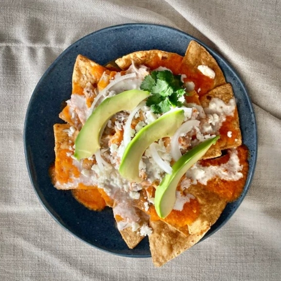 Totopos crujientes en salsa verde fresca con queso y crema.