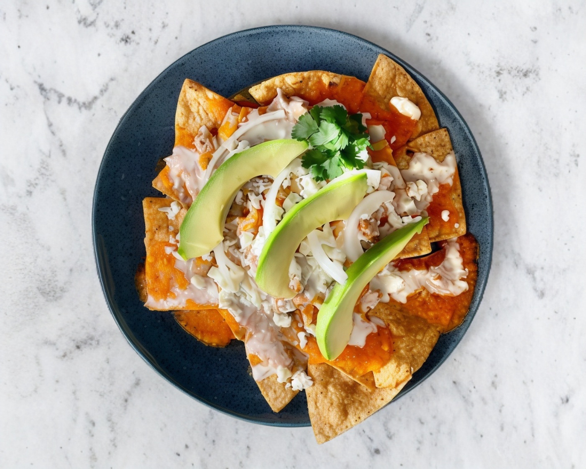 Tortillas fritas bañadas en salsa roja o verde, con cebolla, queso, crema, aguacate, cilantro y pollo