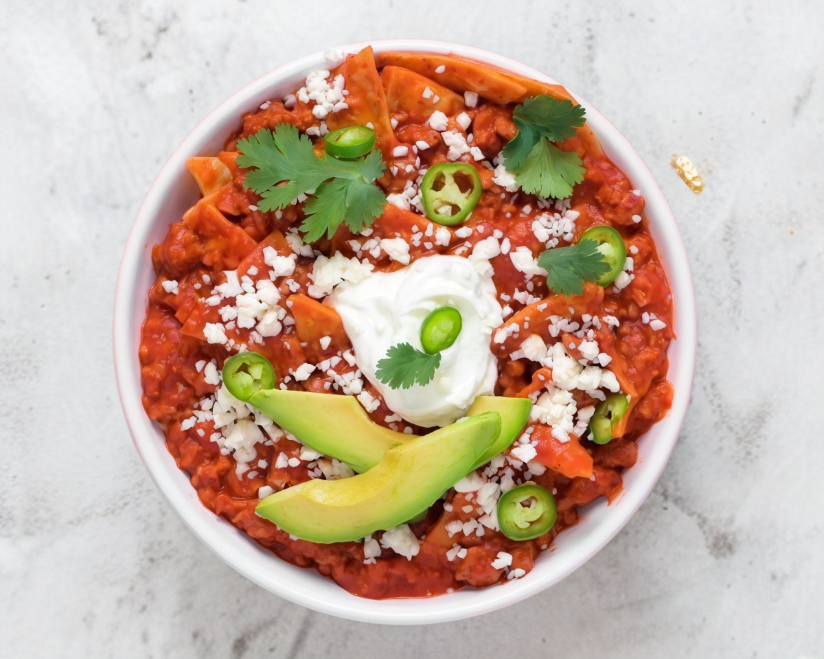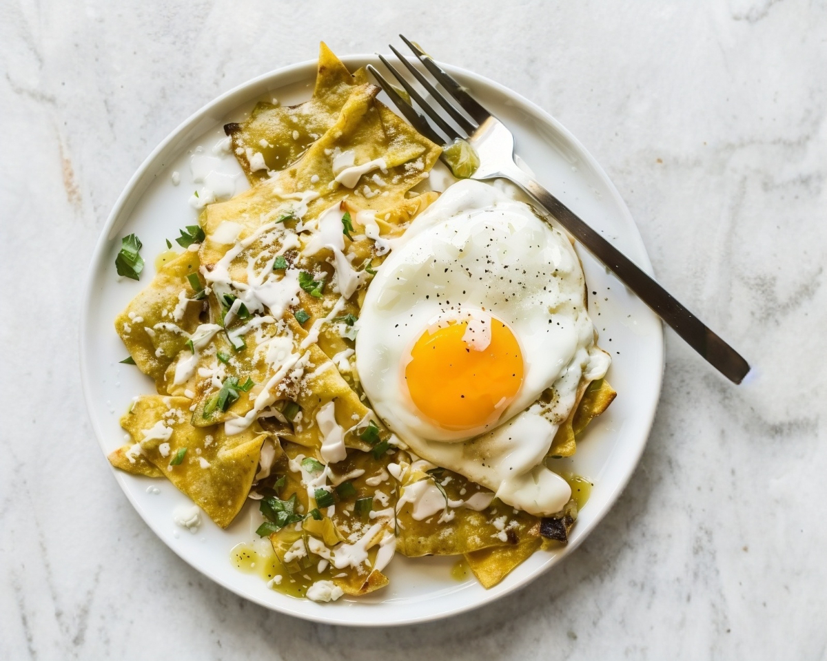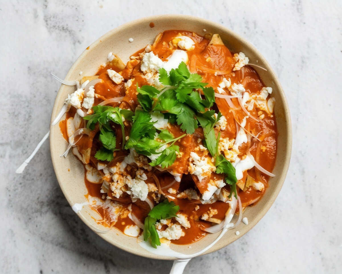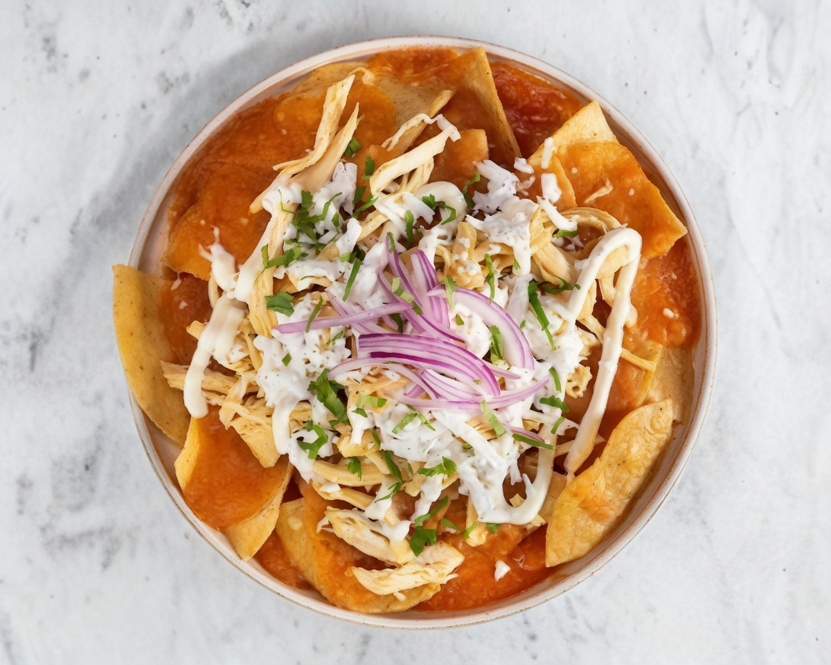 Tortillas fritas bañadas en salsa roja o verde, con cebolla, queso, crema, aguacate, cilantro y huevo