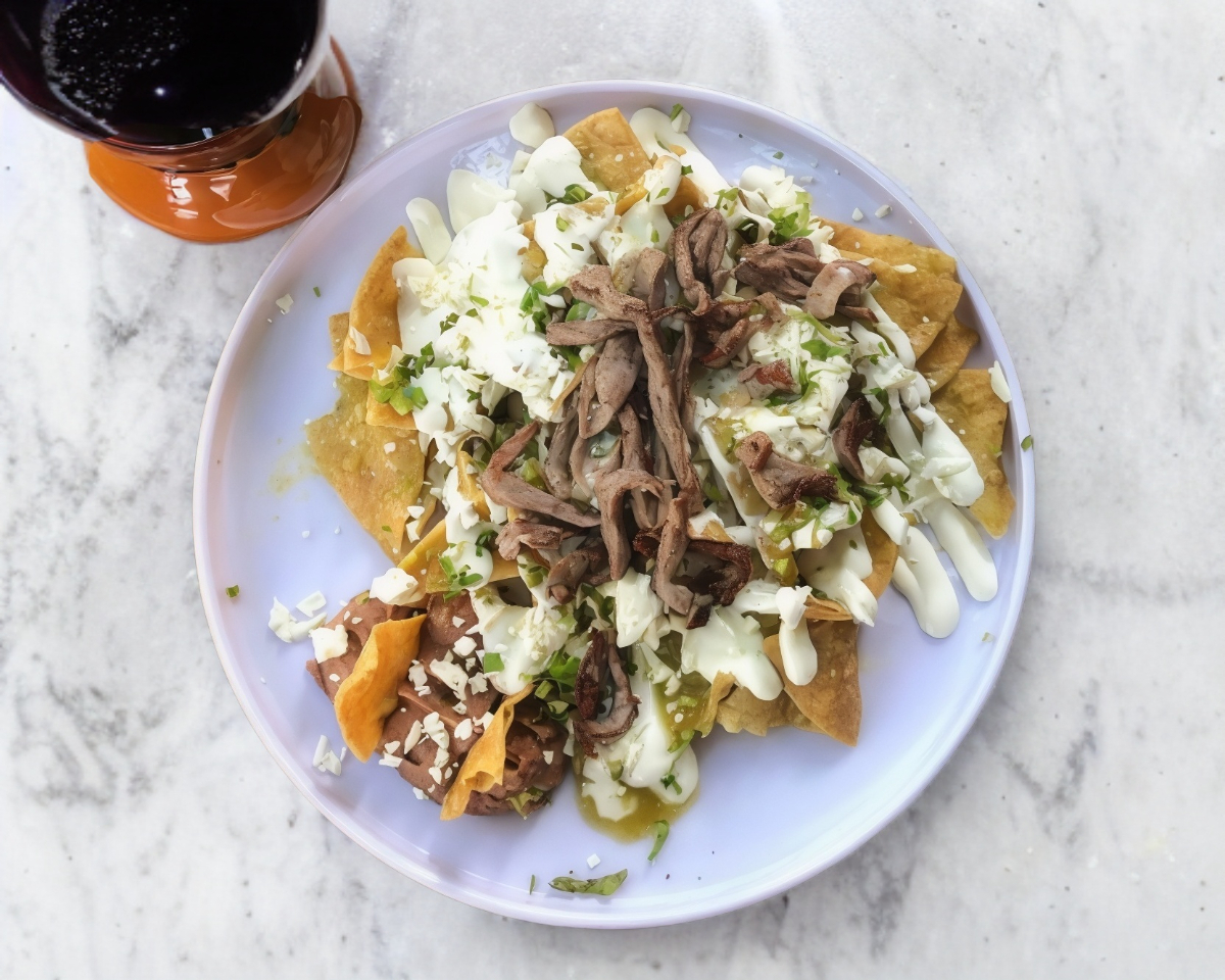 Tortillas fritas bañadas en salsa roja o verde, con cebolla, queso, crema, aguacate, cilantro y arrachera