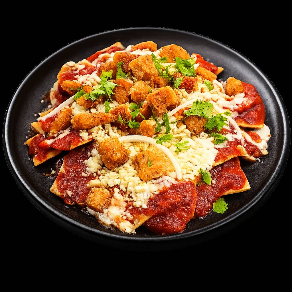 Totopos crujientes bañados en salsa roja, verde o divorciada, milanesa de pollo empanizada, media crema, queso doble crema y cebolla