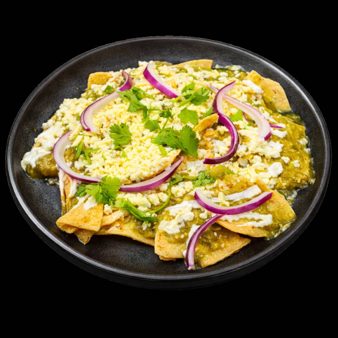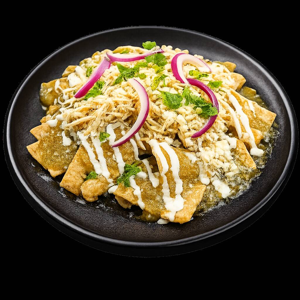 Totopos crujientes bañados en salsa roja, verde o divorciada, pechuga de pollo deshebrada, media crema, queso doble crema y cebolla