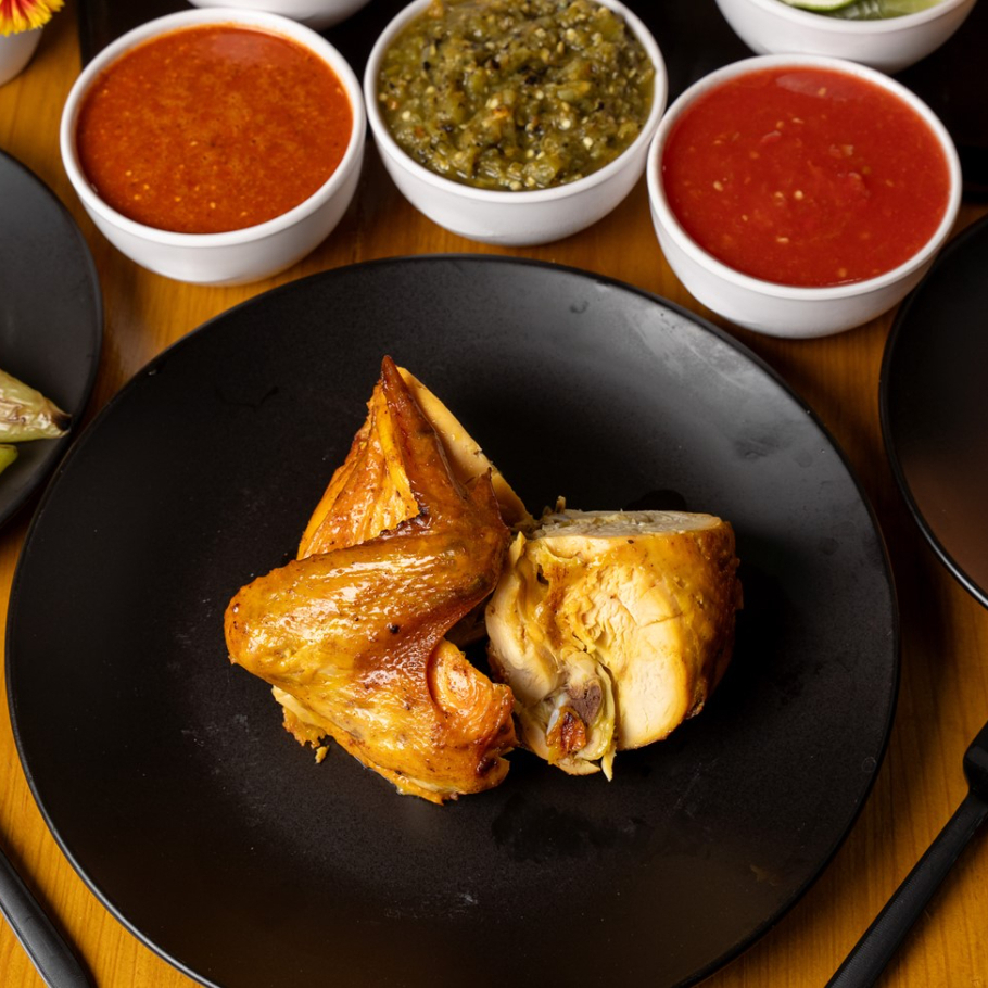 1/2 pollo rostizado estilo ranchero acompañado de arroz, repollo, salsas, limones y tortillas.