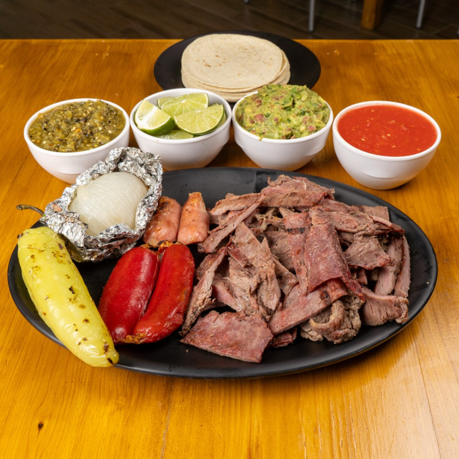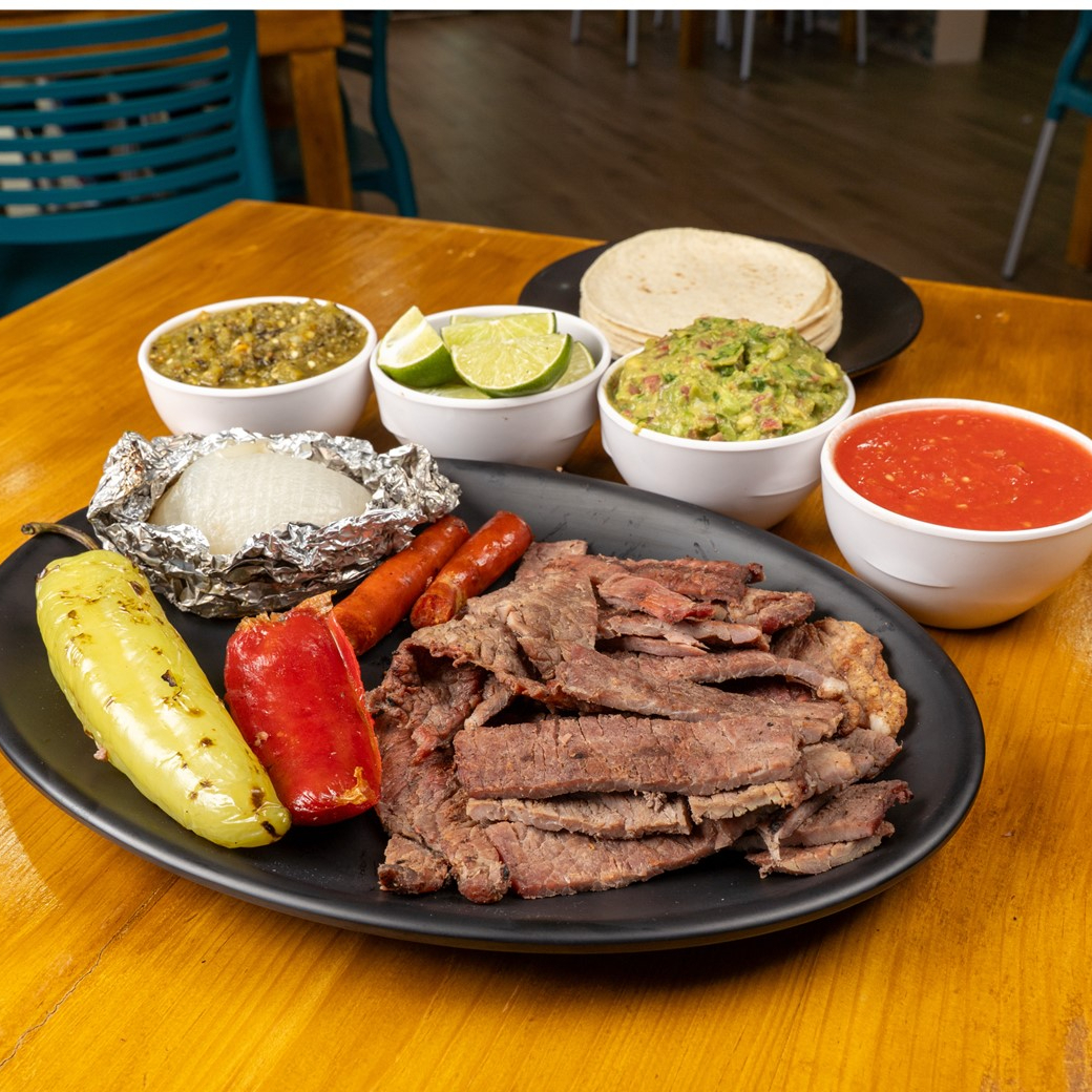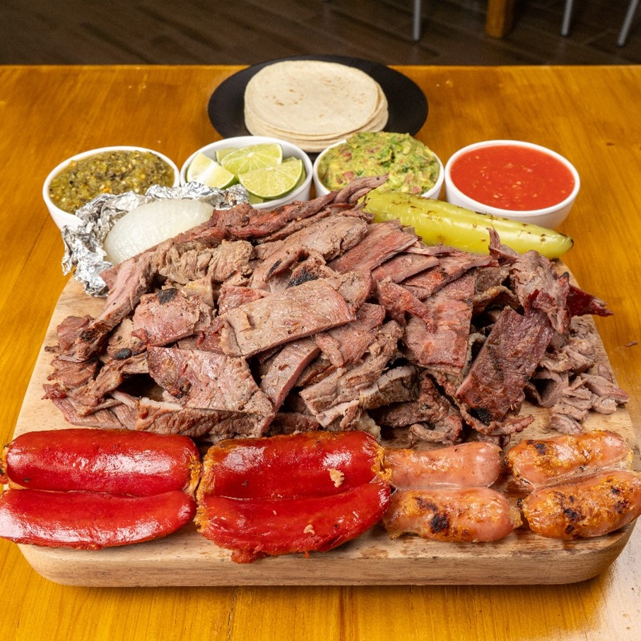 Incluye 1 salchichas rojas, 1 chorizos argentinos, 100g de chistorra, 1 cebolla asada, guacamole, salsas y tortillas.