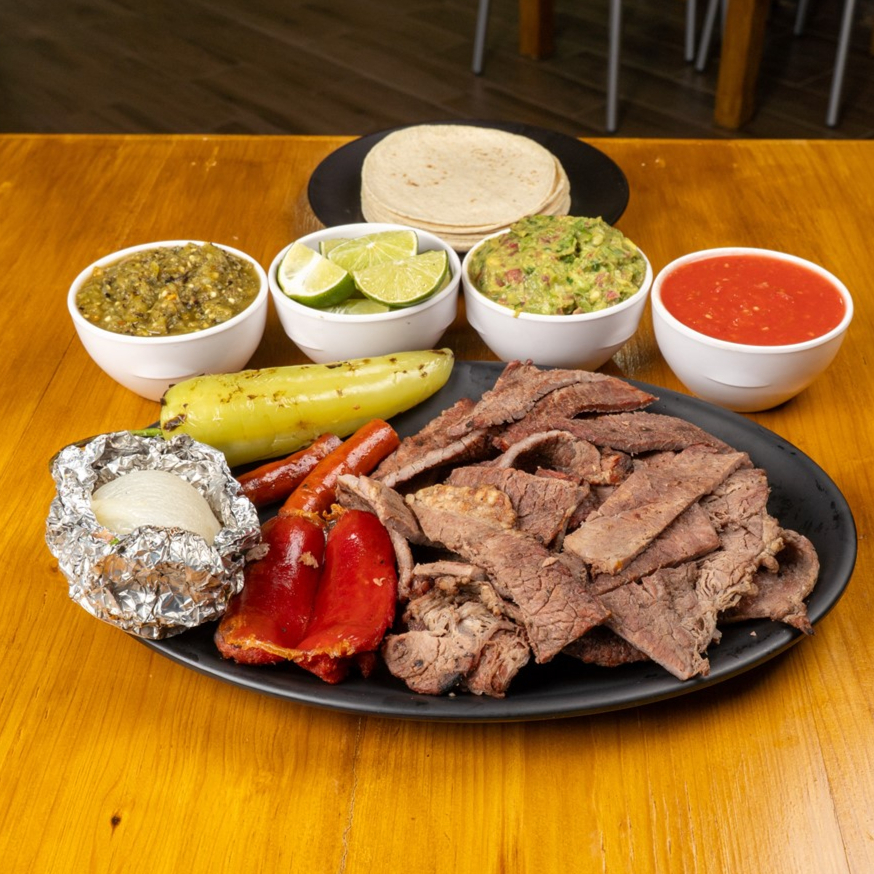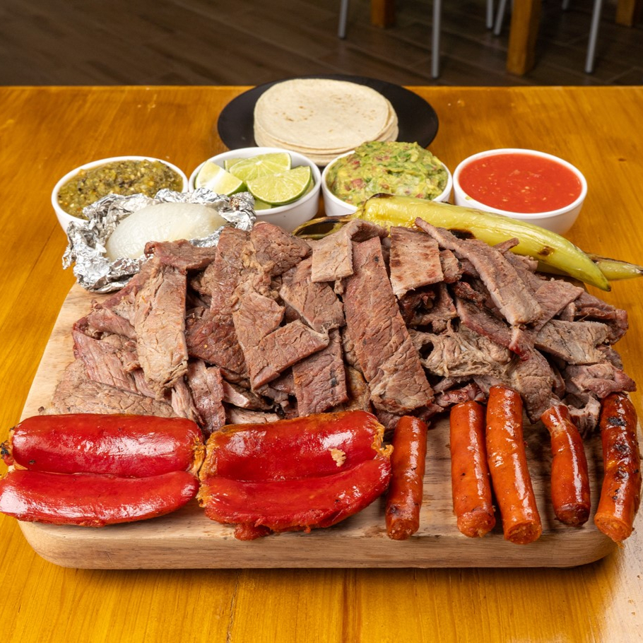 Incluye 2 salchichas rojas, 2 chorizos argentinos, 200g de chistorra, 1 cebolla asada, guacamole, salsas y tortillas.