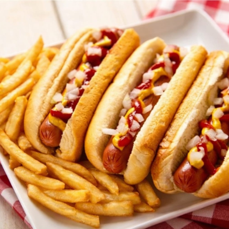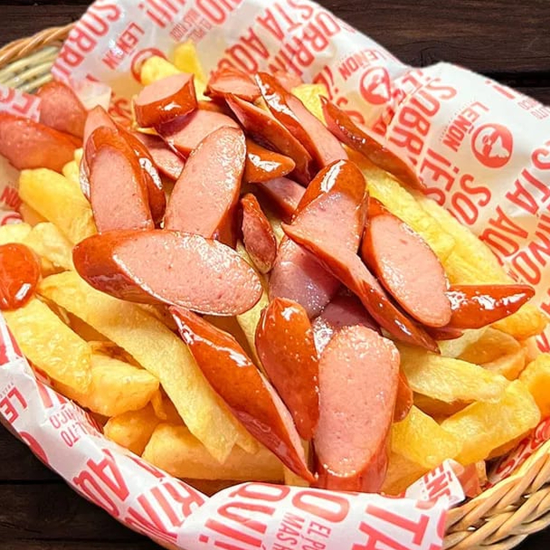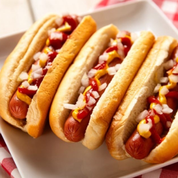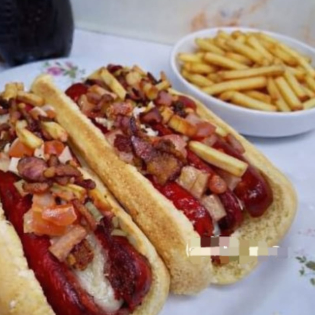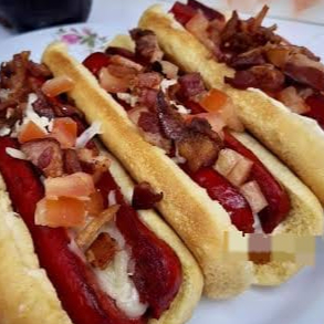 Salchicha Jumbo con queso, tocino y cebolla asada