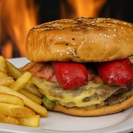 Exquisita carne arrachera con queso, jamon, tocino, acompañada con Salchicha Roja, incluye papas