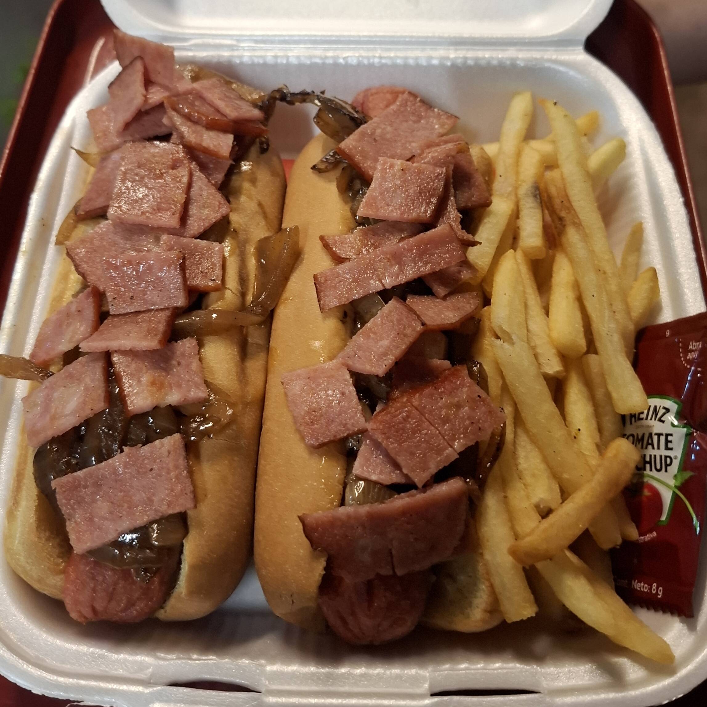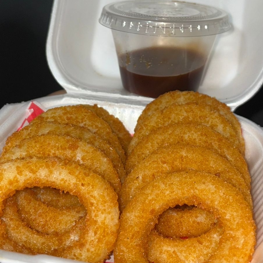 2 pz, salchicha extra jumbo, tocino, 6 pz de aros de cebolla y BBQ, tocino