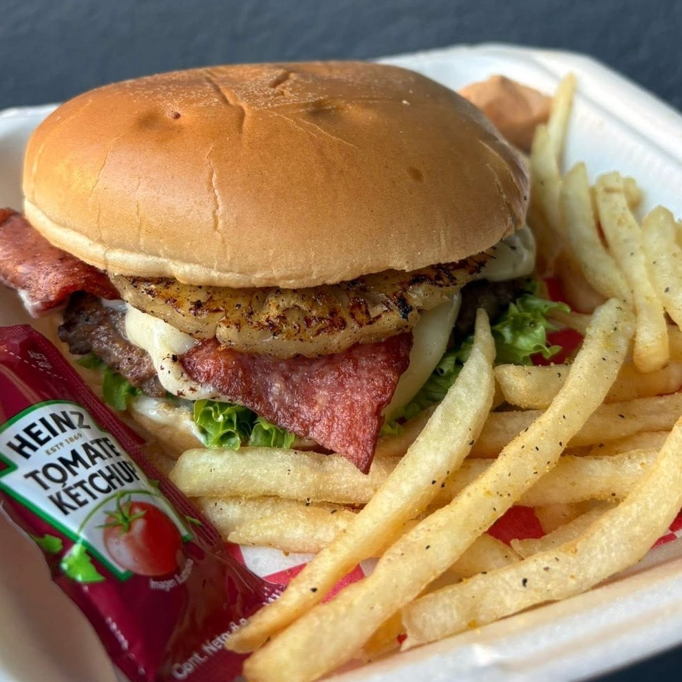 Carne de res (150 g), queso mozarella, piña y lechuga
