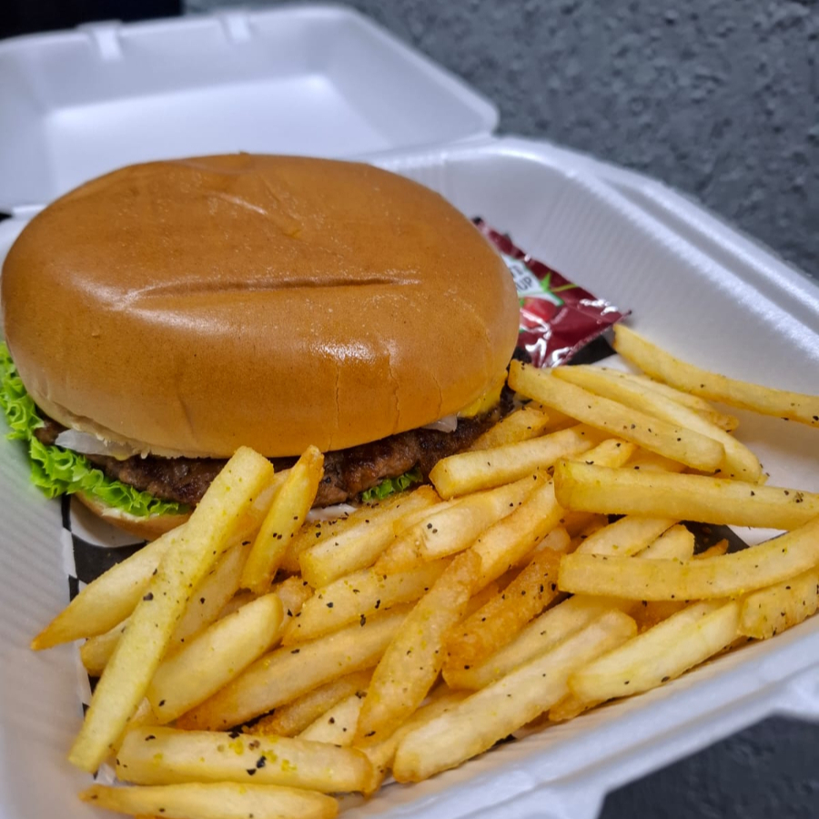 Carne de res (150 g), queso americano, cebolla caramelizada y vegetales