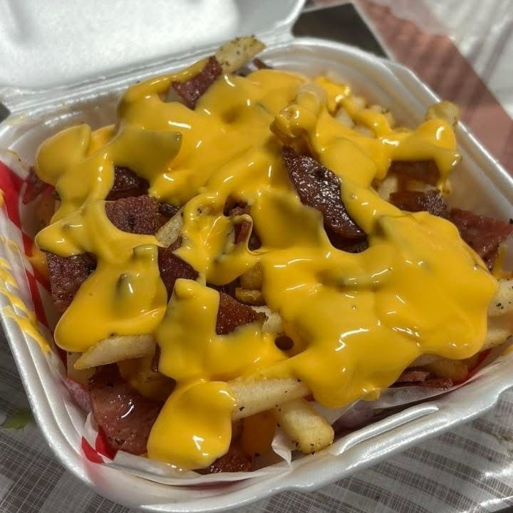 250 g de papas, bañada en queso amarillo y tocino
