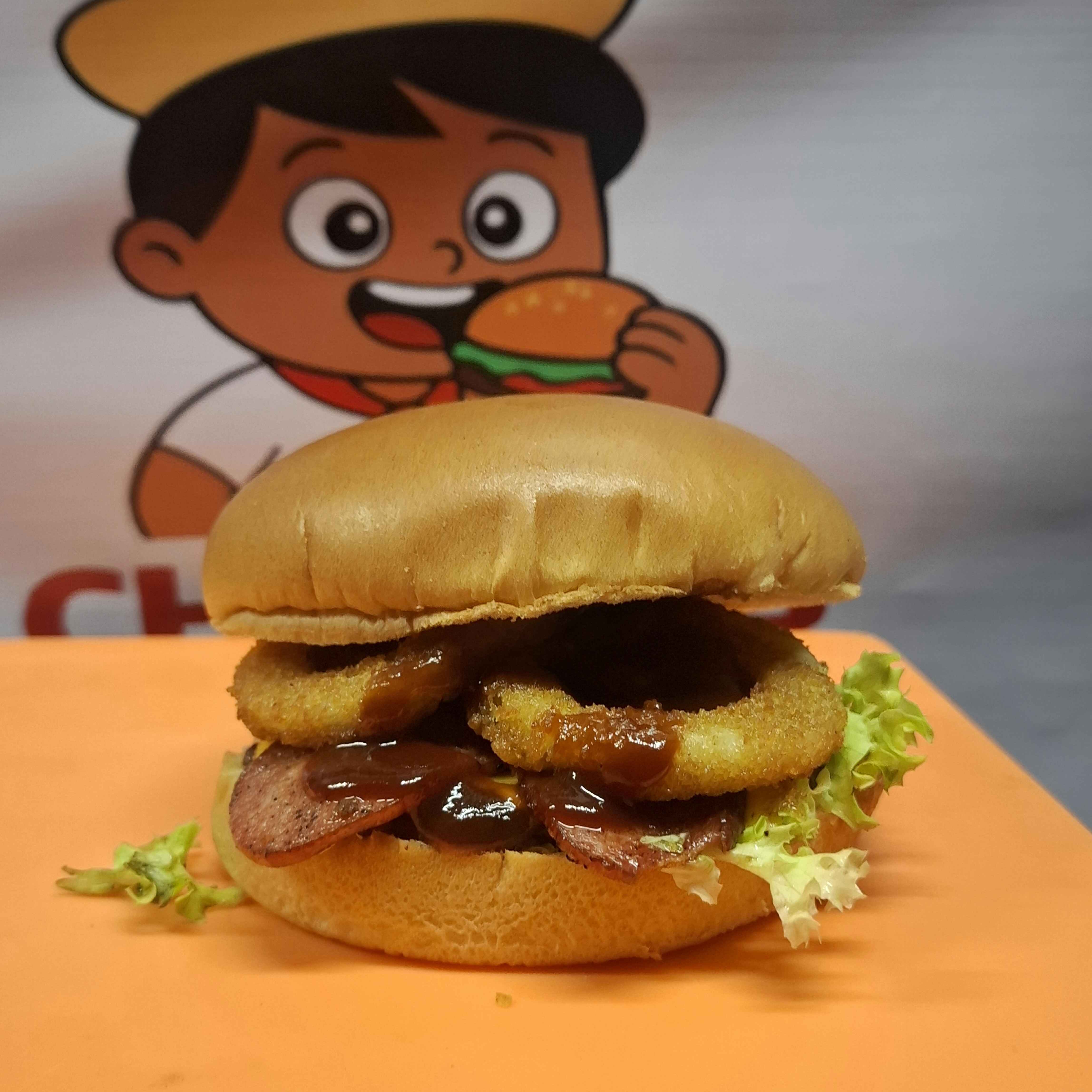 Carne de res (150 g), queso americano, vegetales, BBQ, tocino y aros de cebolla