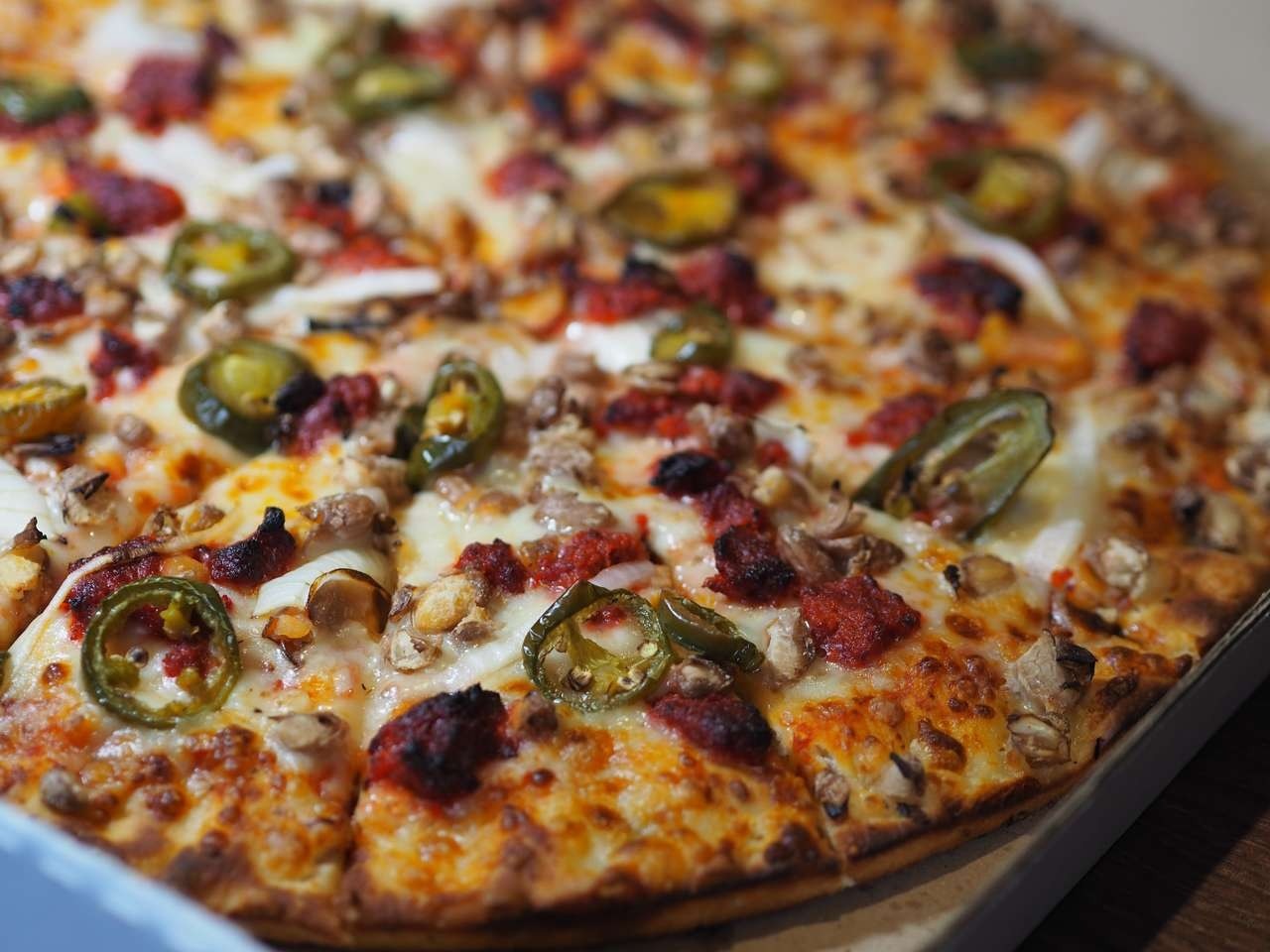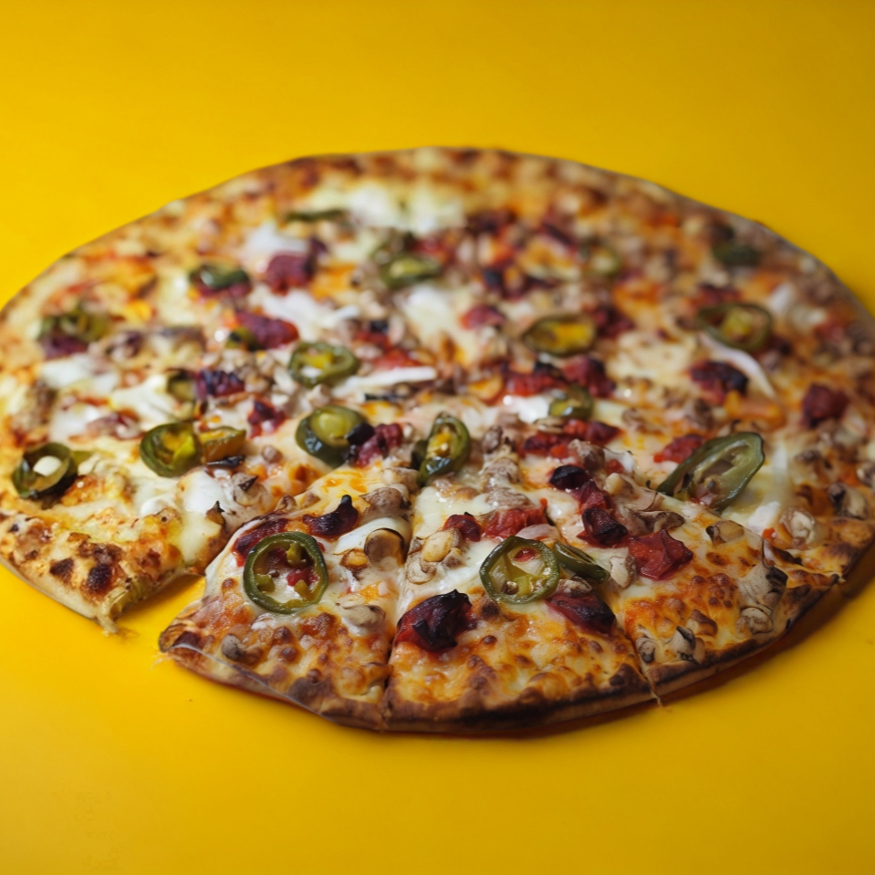 Pizza mexicana grande. Ingredientes: chorizo, queso, elote, cebolla, pimiento, chile jalapeño, salsa de tomate.