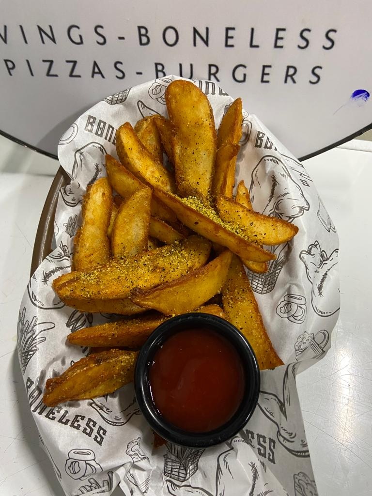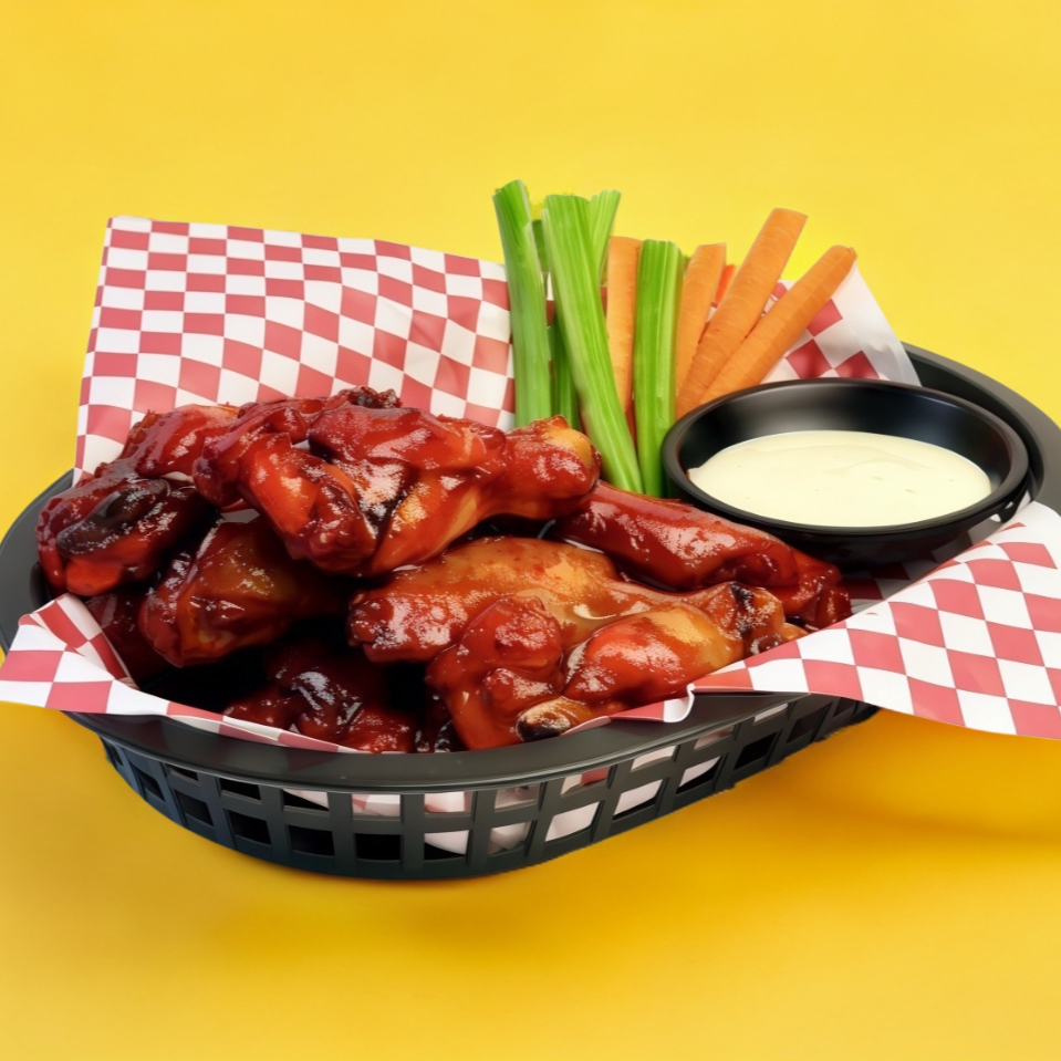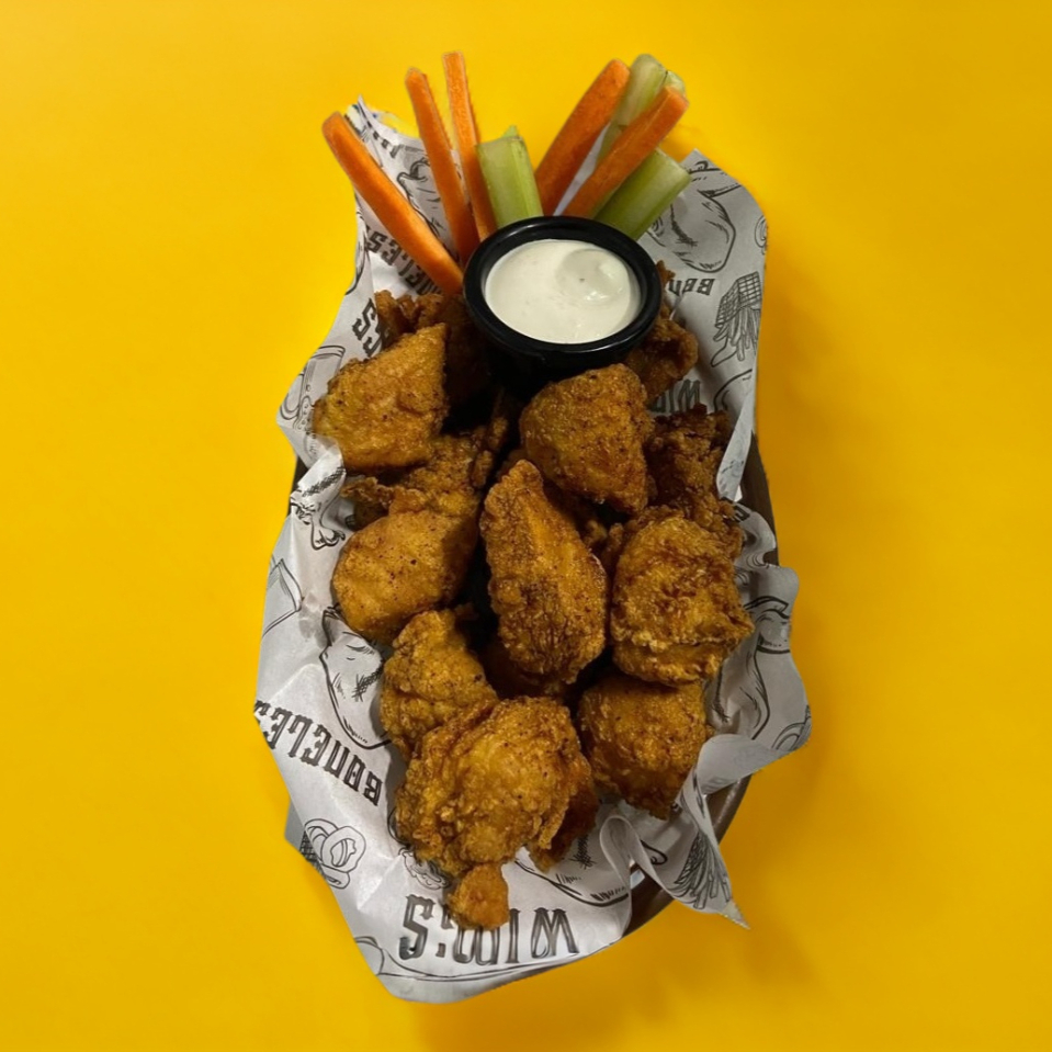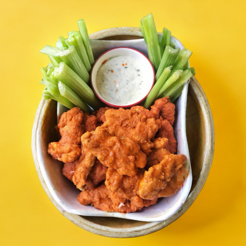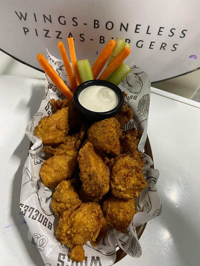 Boneless bañadas de salsa, acompañadas de aderezo ranch, palitos de zanahoria y apio. 1 kg para compartir entre 2 personas aproximadamente.
