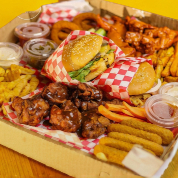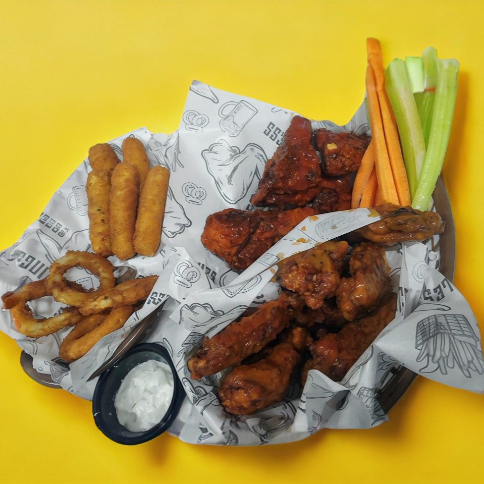300gr alitas, 300gr bonneles, papas ala francesa, papas gajo, 5 aros de cebolla, 5 dedos de queso, 2 hamburguesa jr.