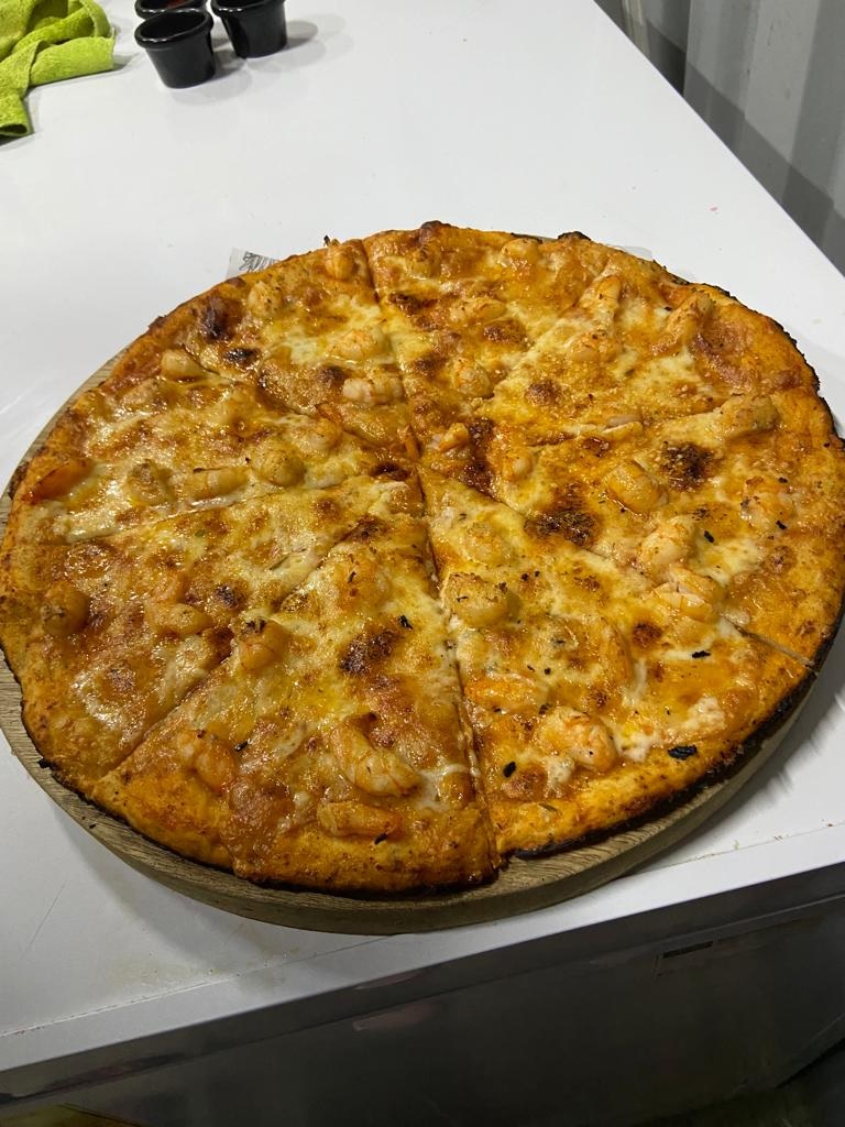 Pizza de camarón grande. Ingredientes: camarón, queso, salsa de tomate.