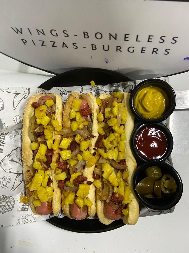 Orden de 3 hot dogs, salchicha jumbo, pan, cebolla caramelizada con jamón y y tocino, piña.