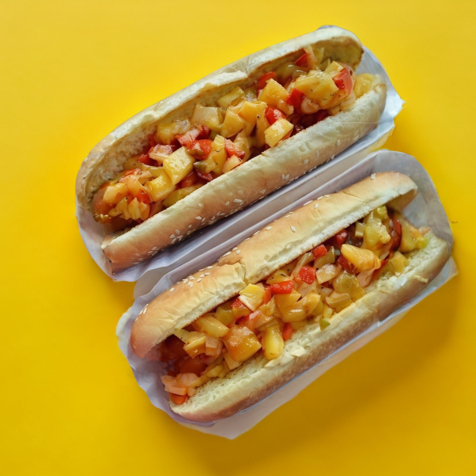 Salchicha jumbo, pan, cebolla caramelizada con jamón y y tocino, piña.