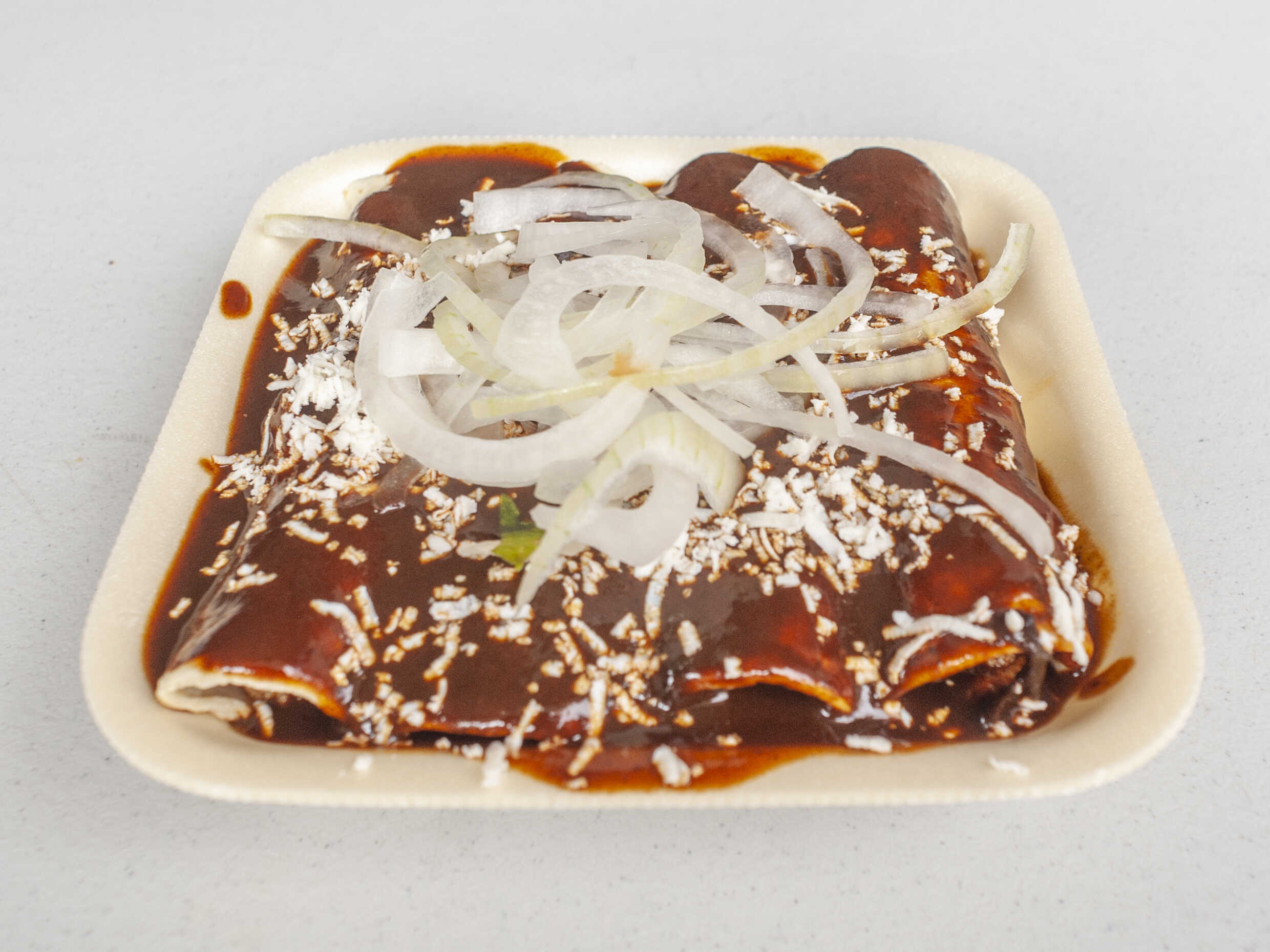 Enchiladas de mole con carne molida, preparadas con queso y cebolla.