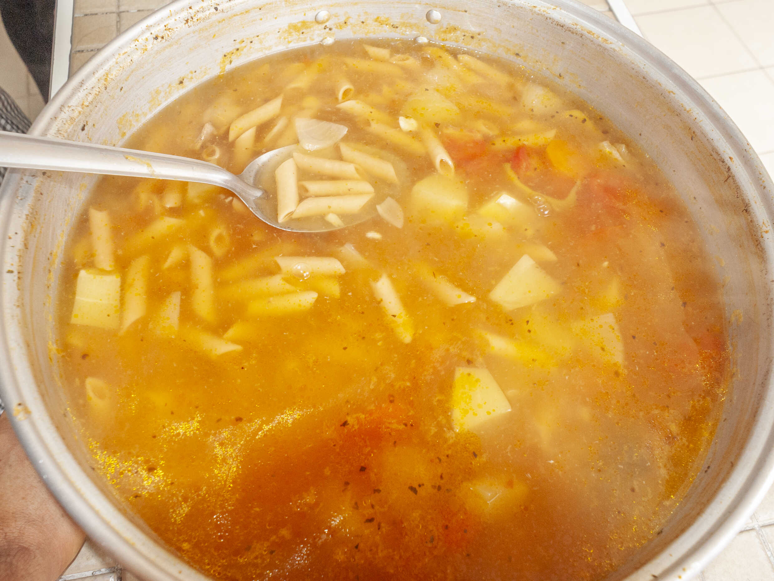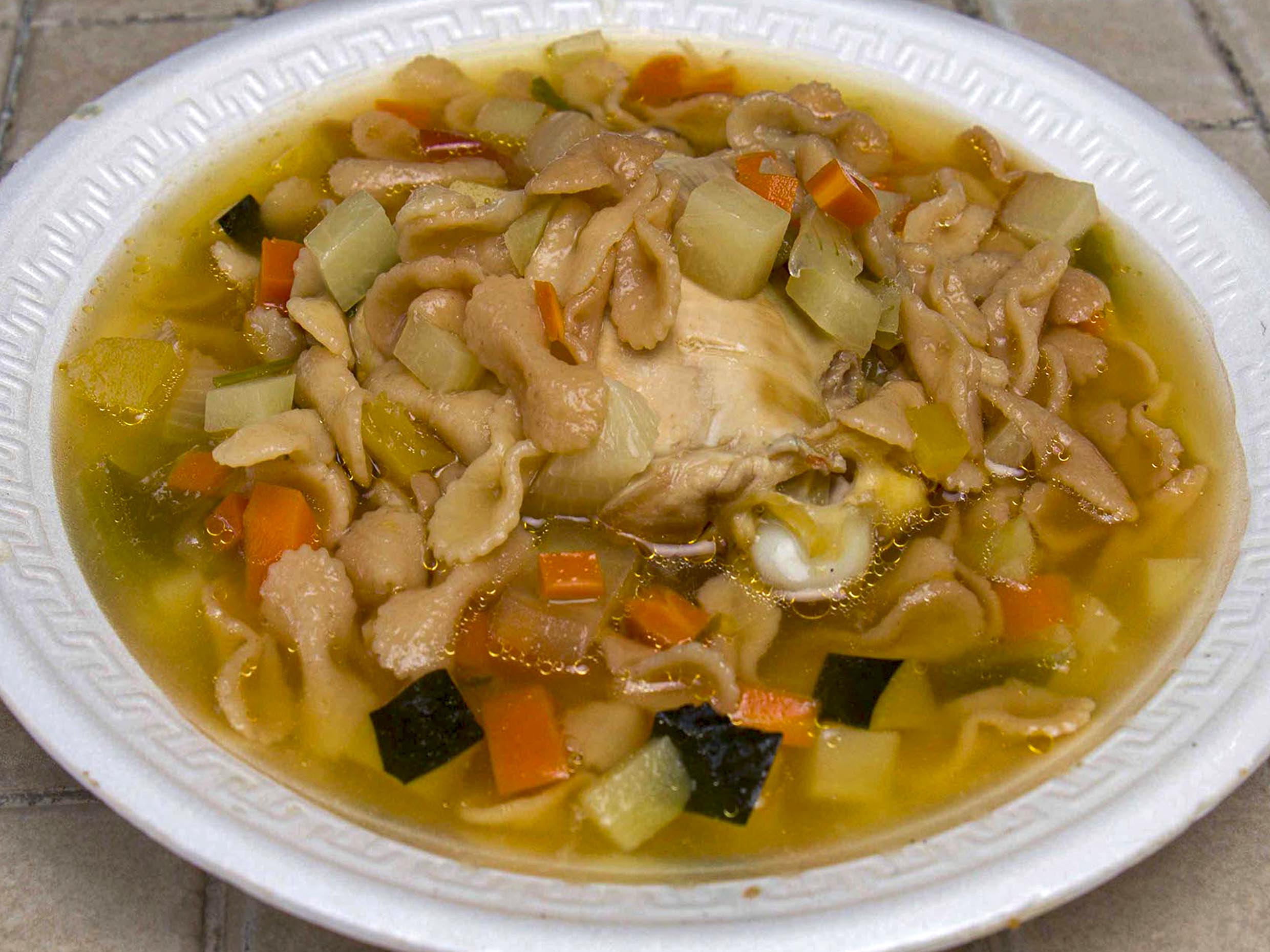 Sopa de pasta con verduras y 2 piezas de pollo, acompañada de tortillas.
