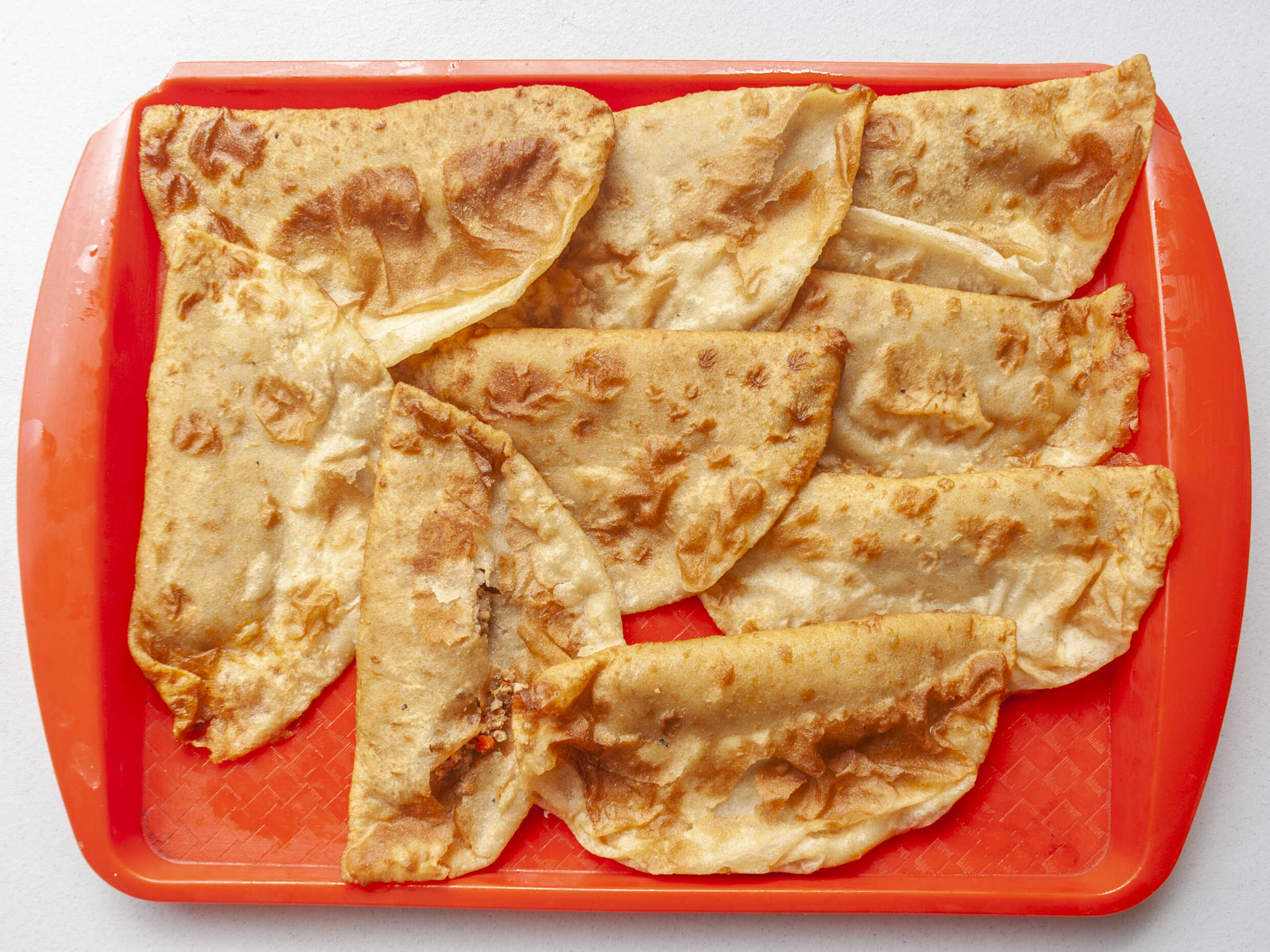 Empanadas grandes de carne molida, con ensalada de repollo aparte.