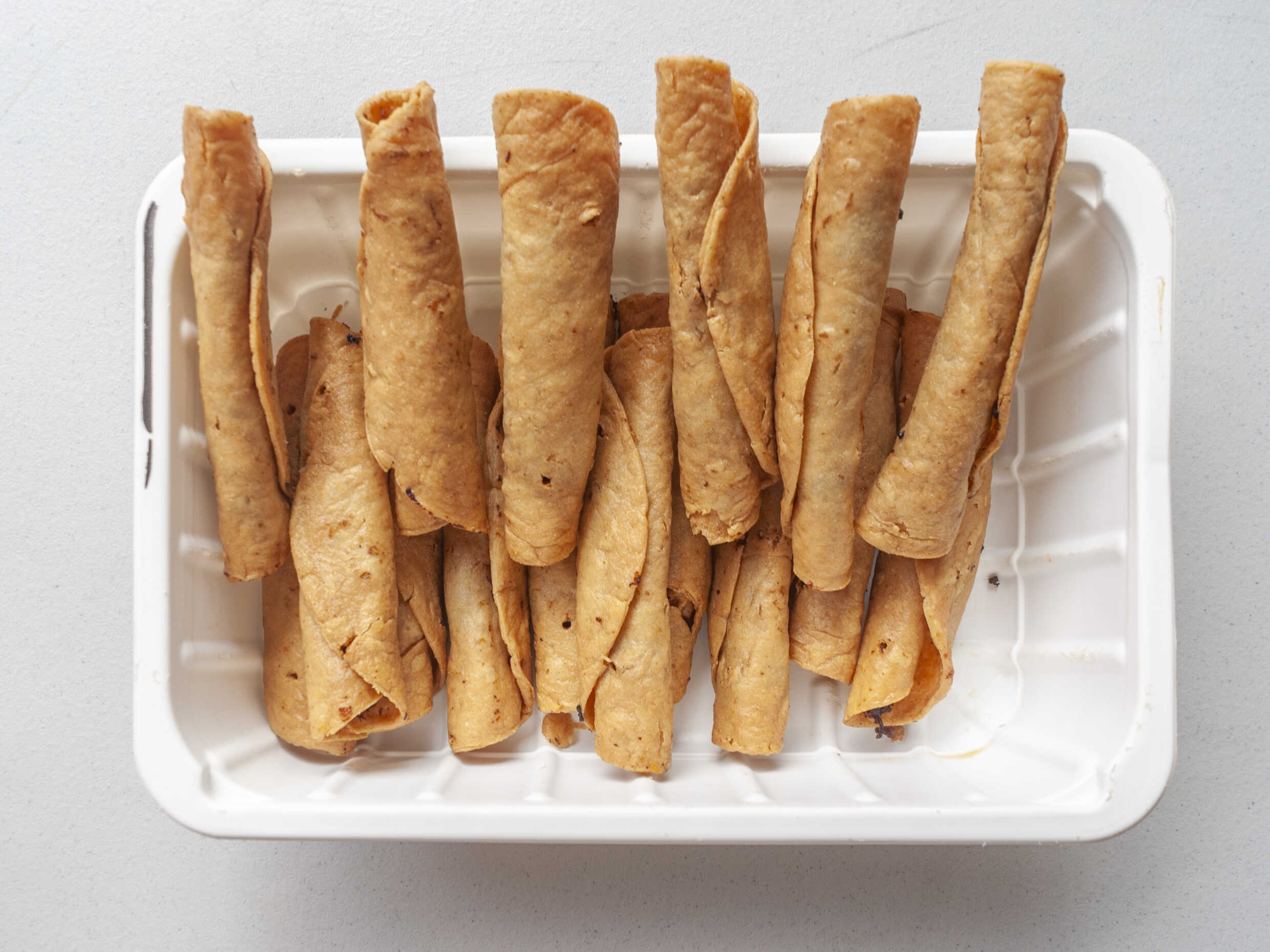 Flautas de carne molida, preparadas con queso, crema y ensalada de repollo.