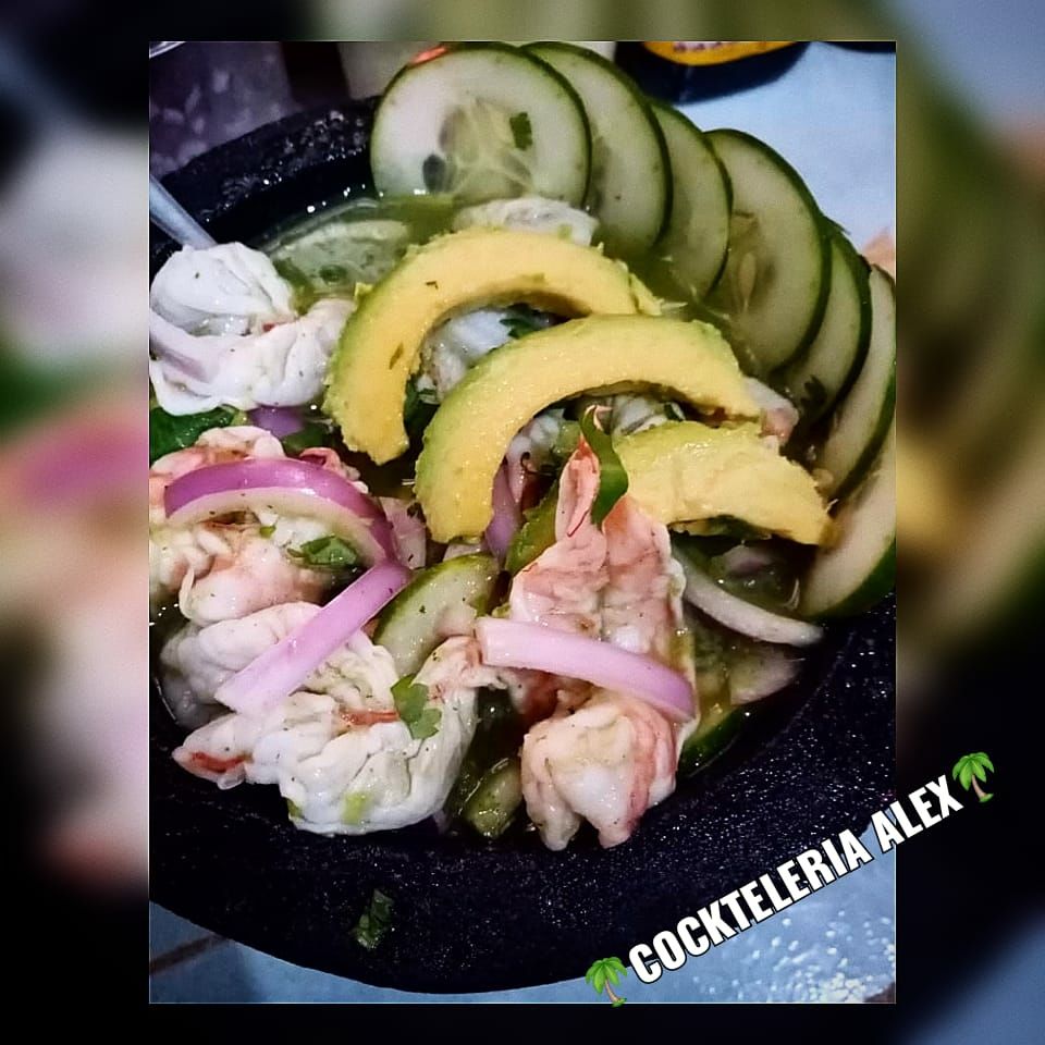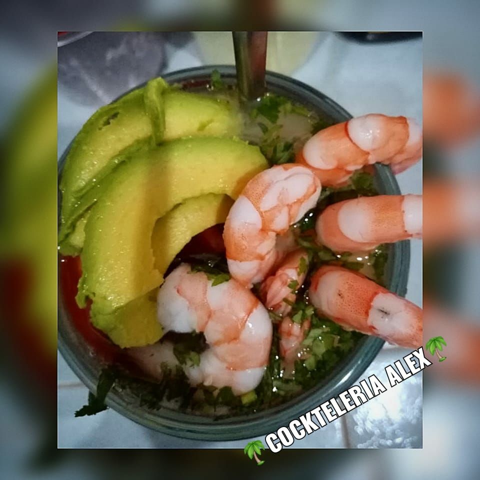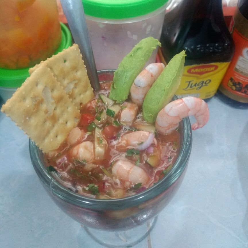 Preparado con, camarón, caracol, pulpo, jaiba, ostión, papá, zanahoria, cebolla, cilantro, aguacate y catsup
