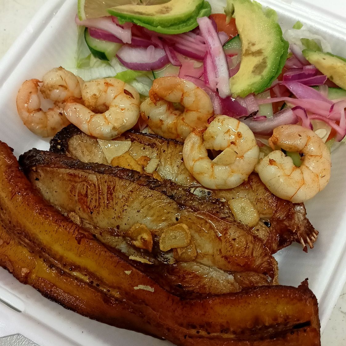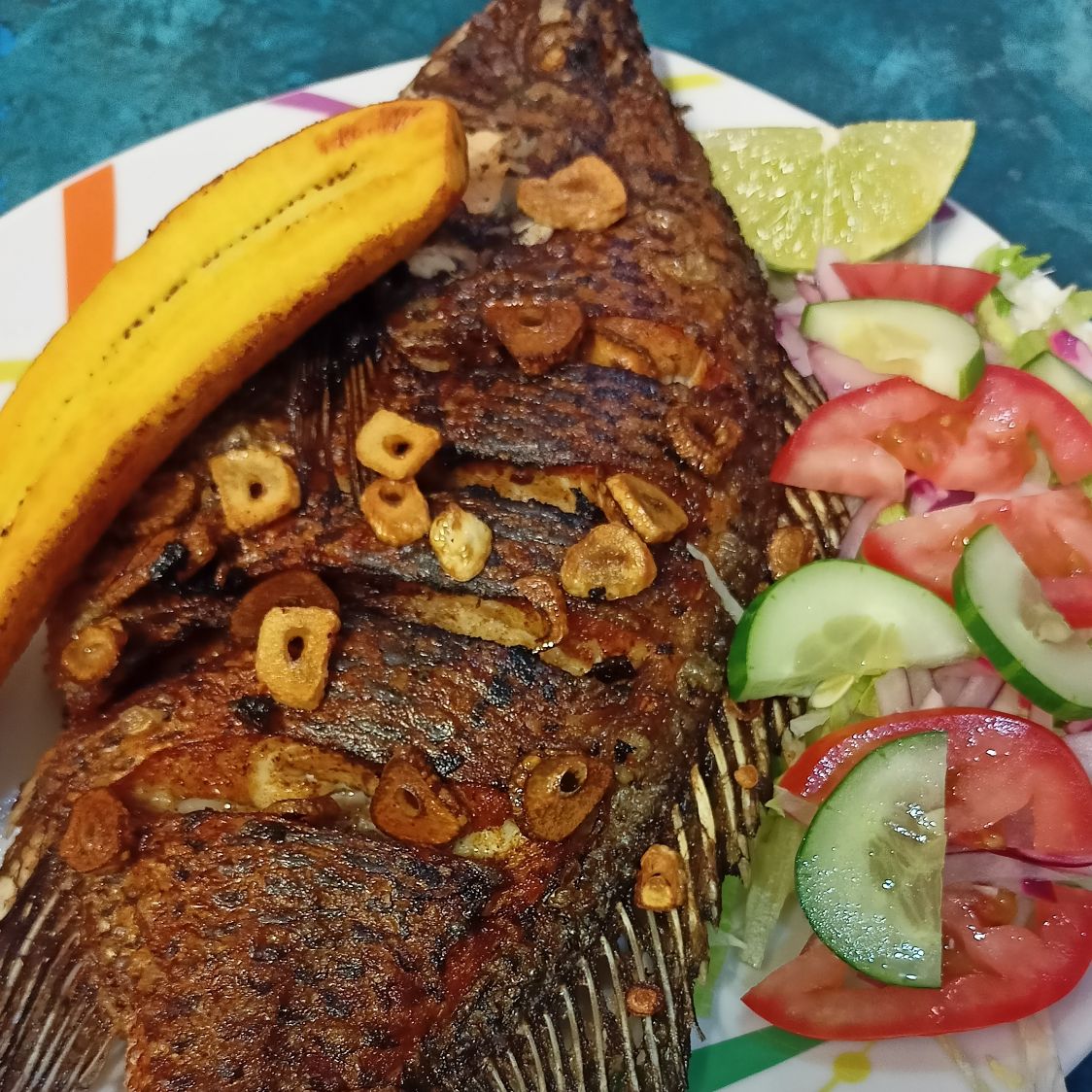 Mojarra frita con ensalada y plátano frito