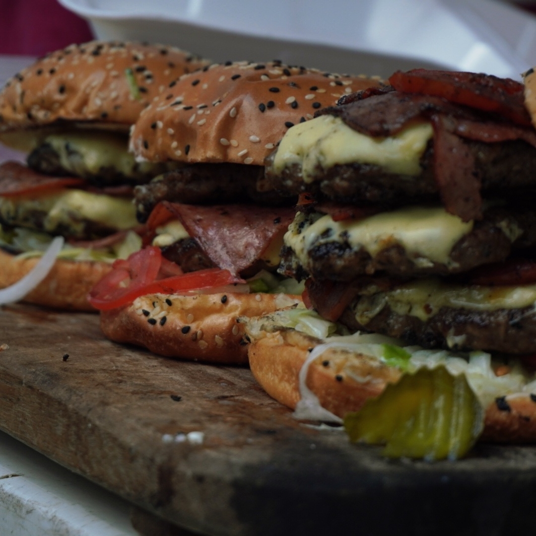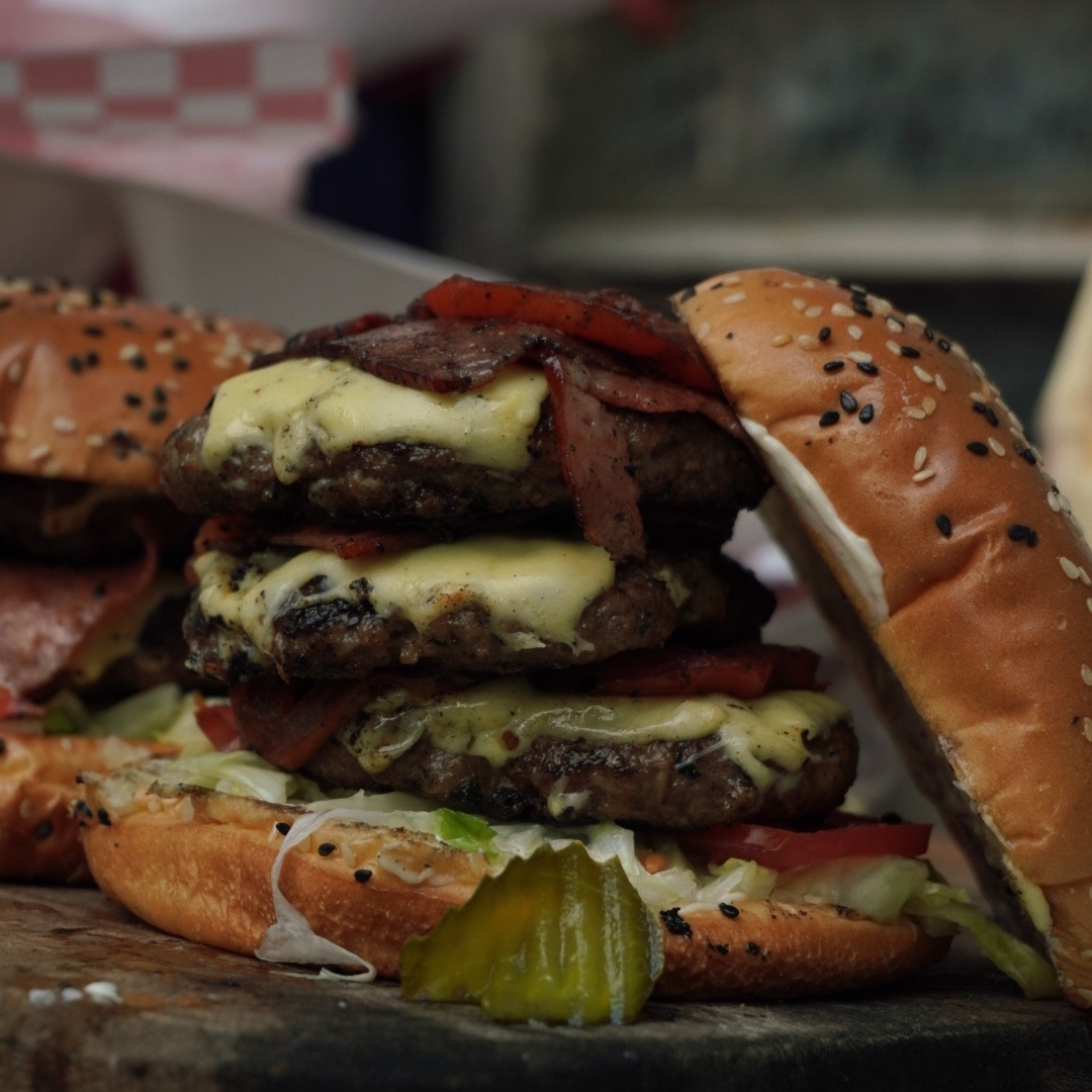 Deliciosa hamburguesa a la parrilla triple carne acompañada con pan tradicional, mayonesa, cebolla caramelizada, tomate asados, pepinillos, queso mezcla, tocino tostado, lechuga.