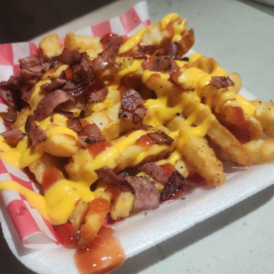 PAPAS ONDULADAS PERFECTAMENTE FRITAS CON TOCINO TOSTADO, CON NUESTRO DELICIOSO QUESO NACHO Y CATSU