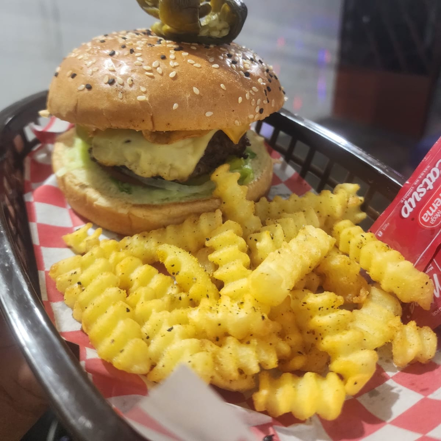 Deliciosa hamburguesa a la parrilla con pan tradicional acompañada de aderezo jalapeño, cebolla, pepinillo caramelizada, tomate, papas chips, carne, lechuga