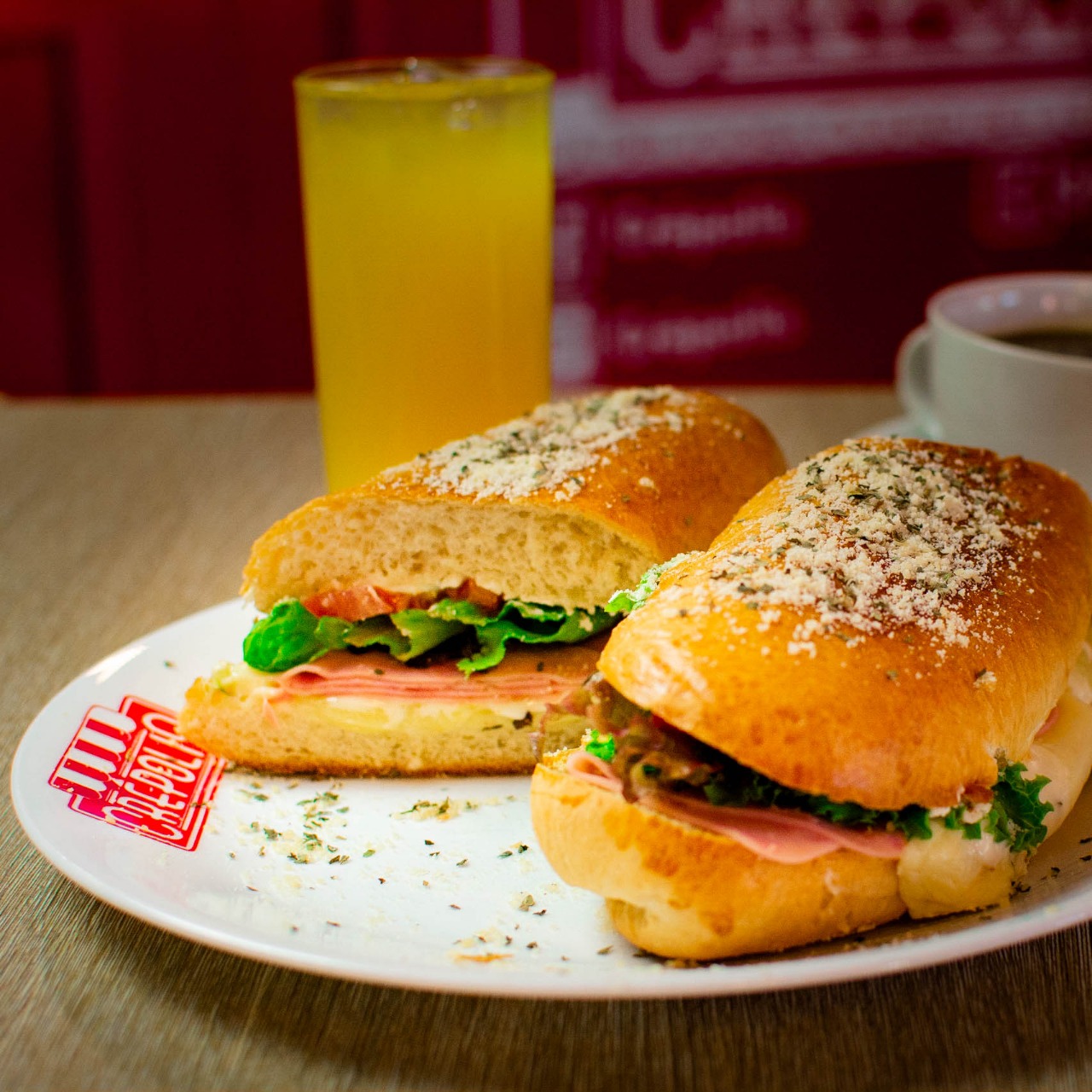Deliciosa focaccia italiana de hierbas finas, jamón de pechuga de pavo, queso mozzarella, queso Philadelphia, tomate, lechuga y aderezo especial de la casa.
