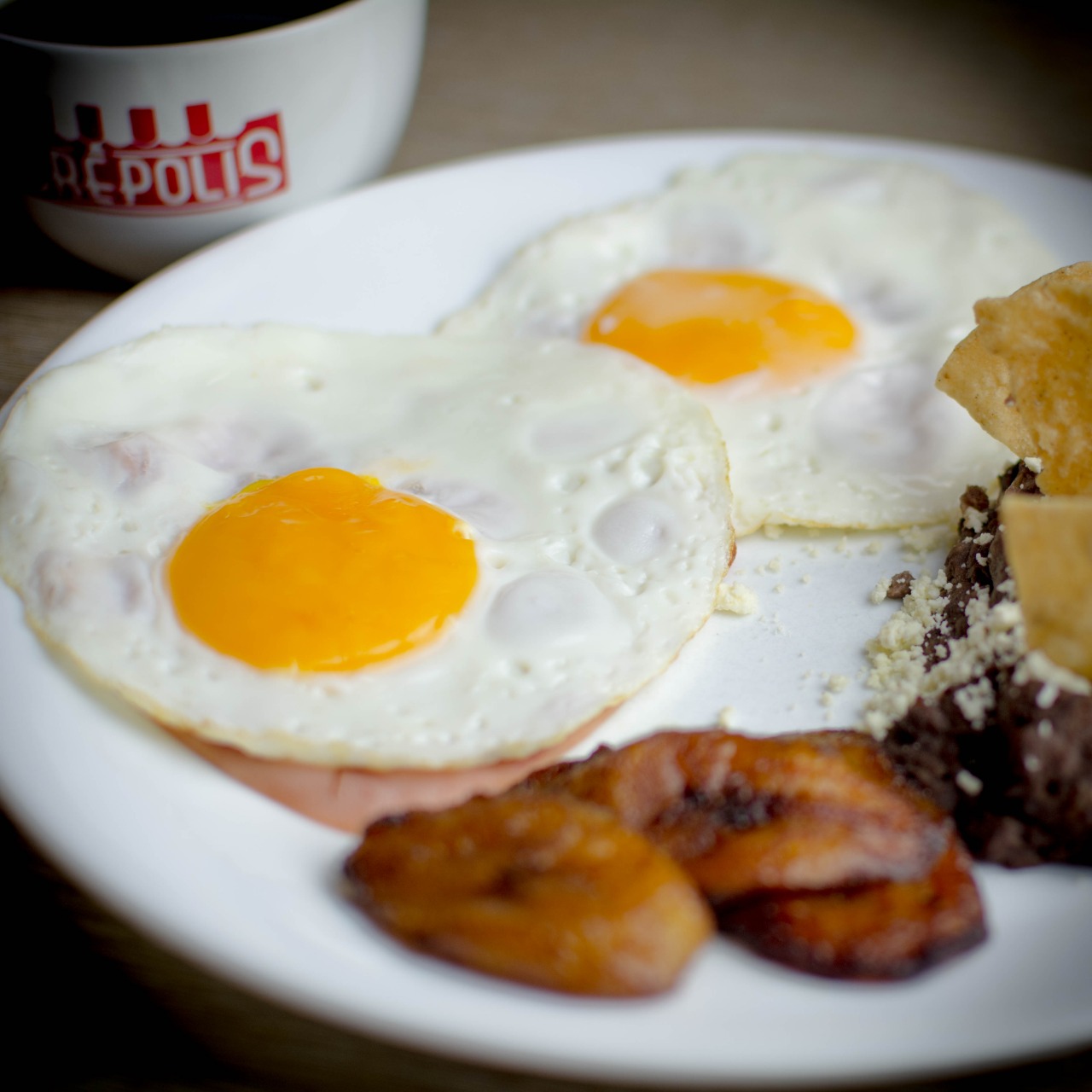 2 huevos estrellados servidos en 2 tortillas fritas, 2 jamones de pavo y salsa roja de tomate, acompañados de firjoles con queso y plátano frito.