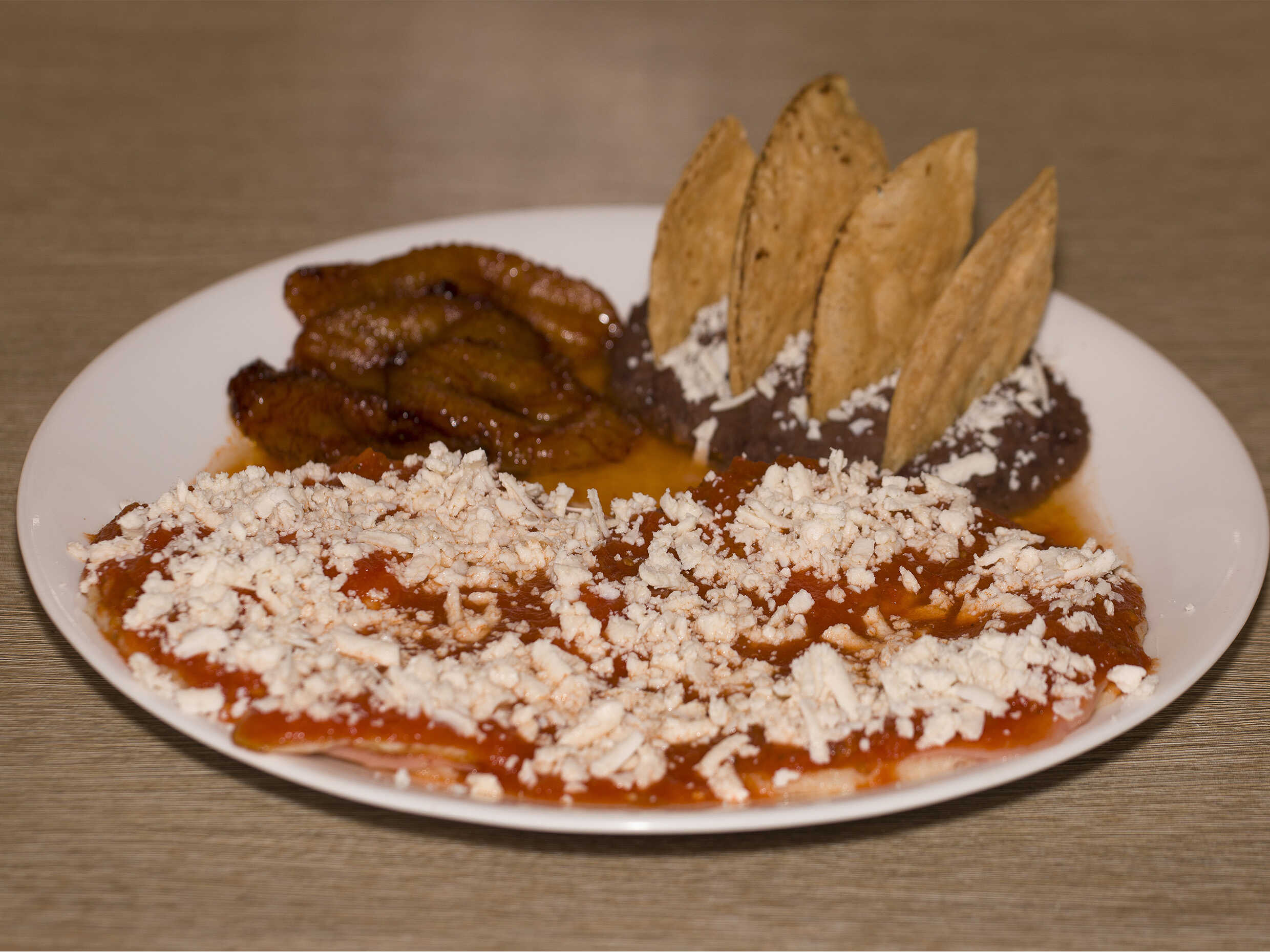Servidos con pollo o con huevo acompañados de queso fresco, frijoles, cebolla y media crema.